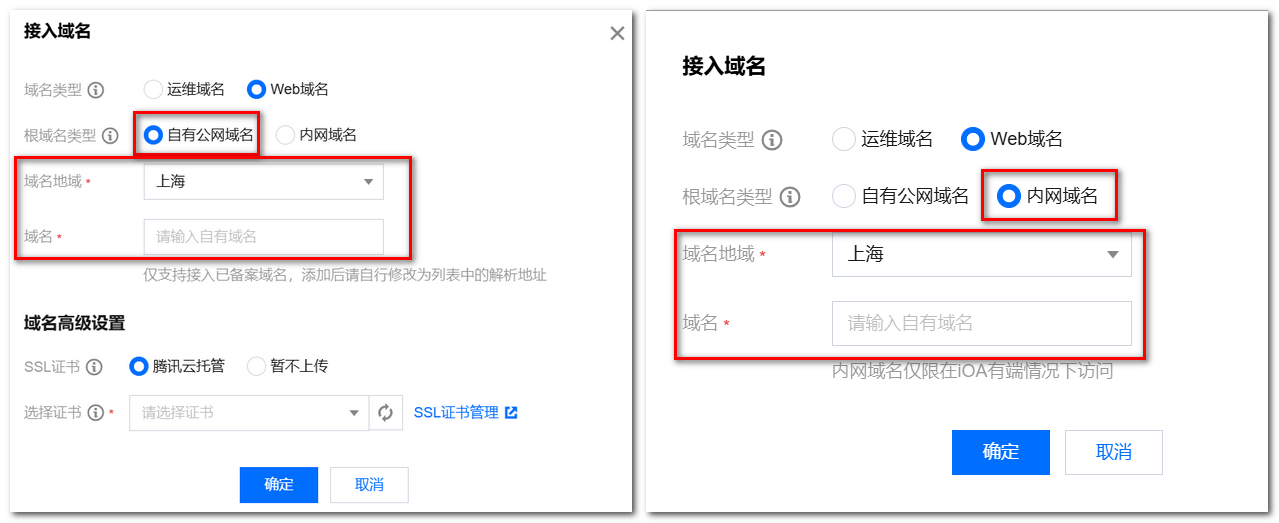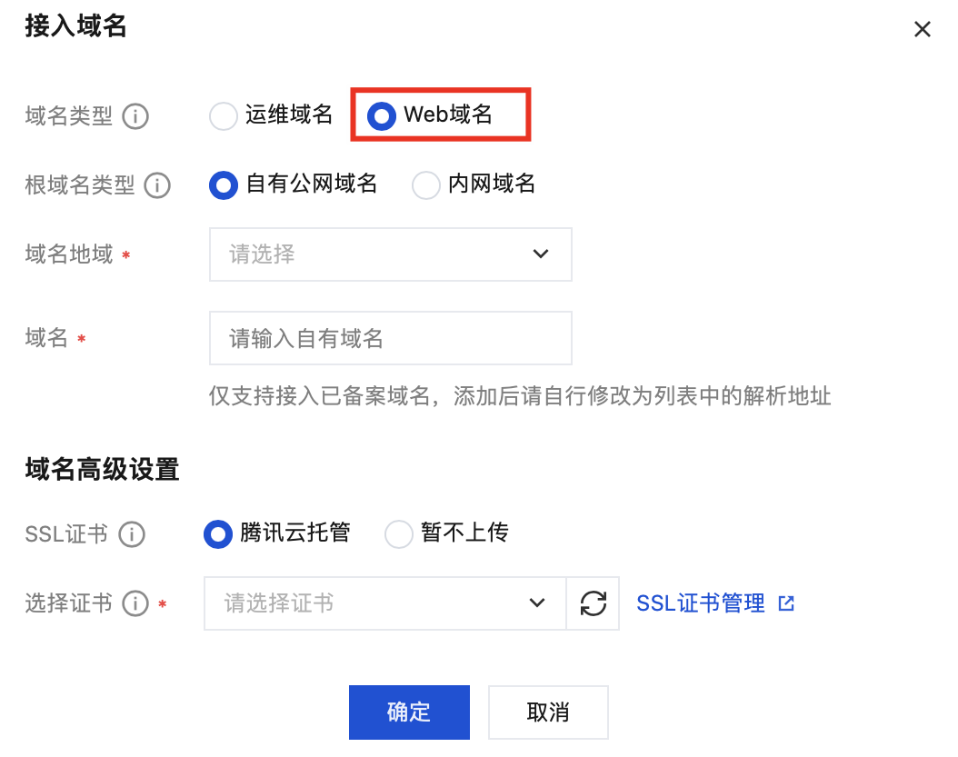2. Web 域名支持接入自有公网域名和内网域名,请确保填入的域名已备案,否则可能无法正常接入。根据提示选择域名需要关联的地域,并填入自定义的子域名前缀。