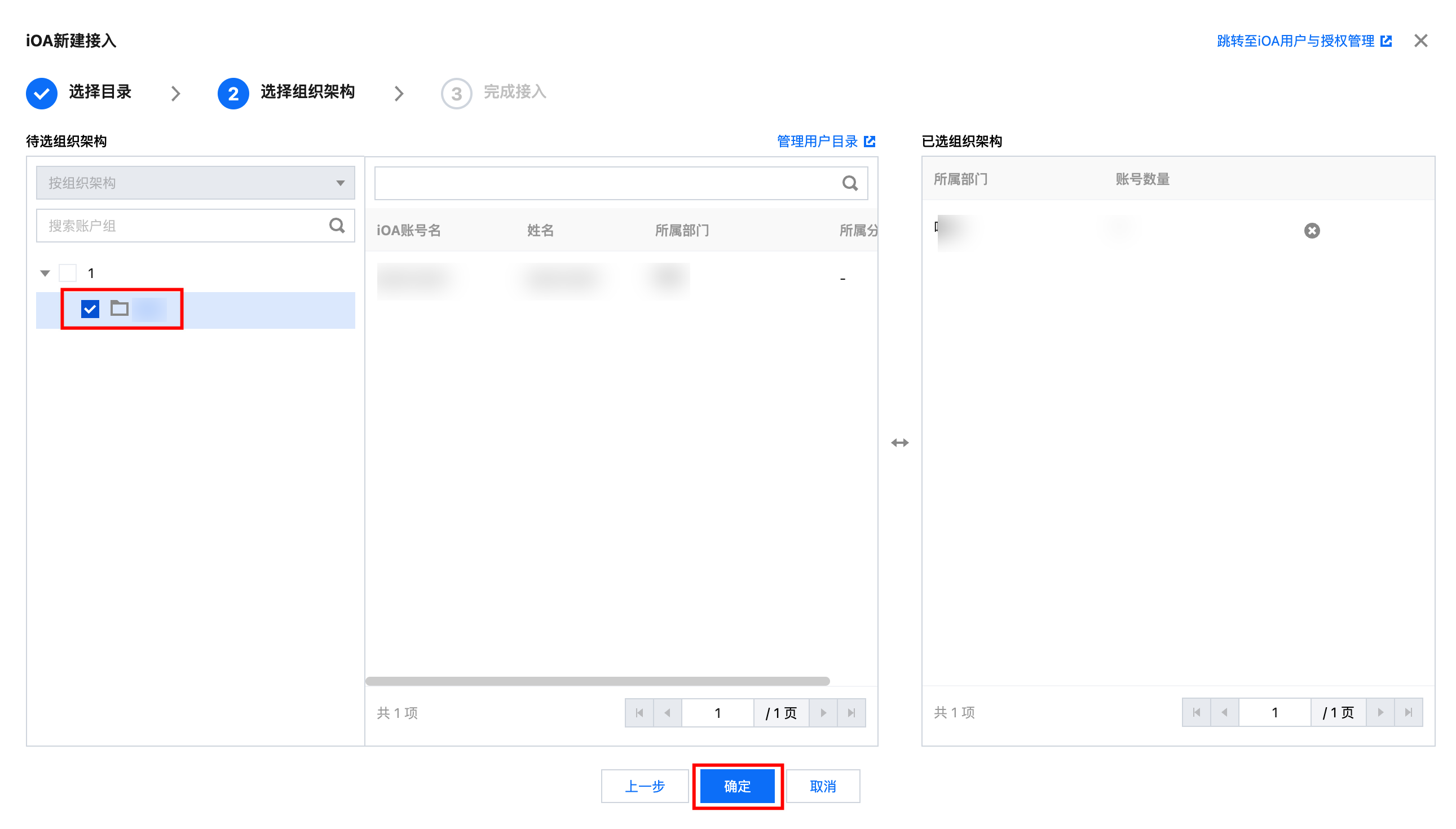 4. 选择当前目录下需要接入的组织架构,核对其包含的账号信息,确认无误后单击确定。