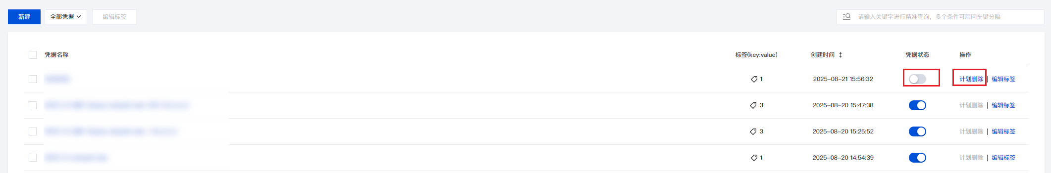 2. 在自定义凭据列表页面,选择需要计划删除的凭据。若凭据处于启用状态,请先将其禁用,然后在操作栏中单击计划删除。