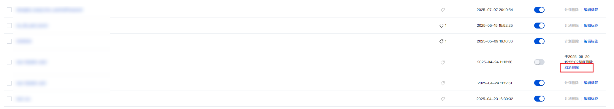 4. 在1 - 30天等待期内,您可以对计划删除的凭据进行取消删除操作。若需取消删除凭据,可以在操作栏,单击取消删除,即可取消删除凭据。确认取消删除后,凭据状态将重置为“启用”状态,可对该凭据进行禁用、修改、删除等操作。