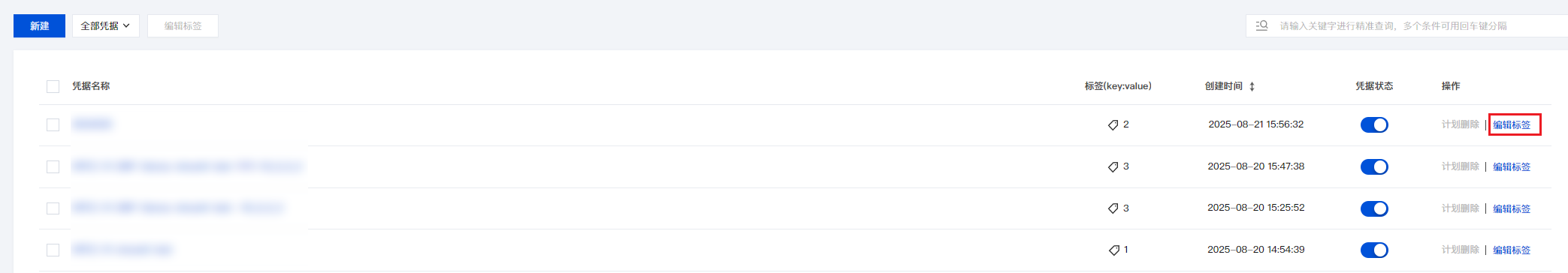 a. 在自定义凭据列表中,找到需编辑标签的凭据,在右侧操作栏,单击编辑标签。