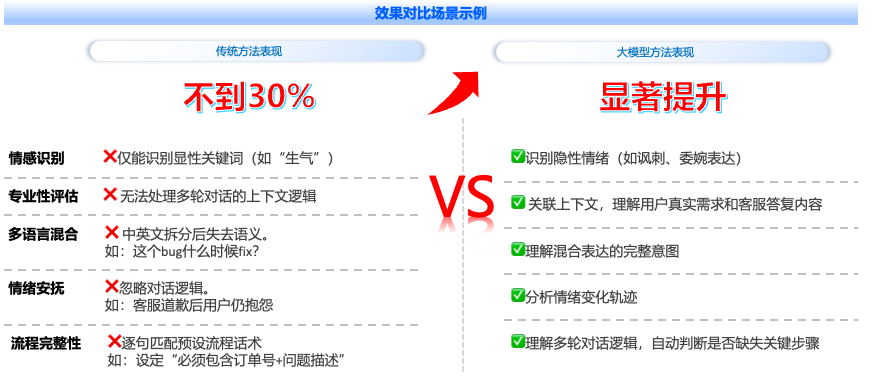 在一些复杂场景中,如投诉情绪识别、服务态度评估、多轮对话逻辑验证、客服专业性评估、风险评估等质检场景中,传统方法只能通过关键词、正则或文本相似度等检测,但整体准确率不到30%,利用大模型质检,整体准确率显著提升。