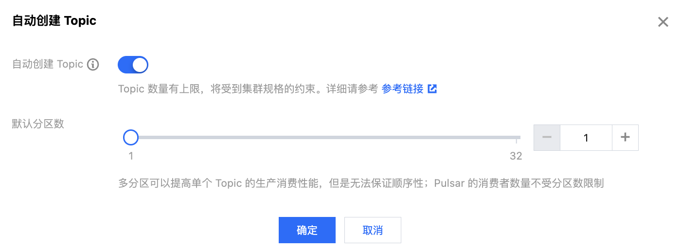 是否分区 | 否 | 支持开启和关闭,默认为开启,开启状态下分区数默认为 2 分区。 分区开关关闭表示不做分区拆分,无需配置分区数。 分区开关开启表示开启分区拆分,需要配置分区数,分区数支持 1 至 32 个分区。 Pulsar 内部可以保证单个分区内的消息有序,即如果创建 1 分区的 Topic 则可以保证全局有序。 单分区的 Topic 会在性能上弱于多分区 Topic,如果希望兼顾性能与有序性, 可以参见 订阅模式 使用 Key-shared 模式进行消费,实现局部有序,标记同一个 key 让需要有序的消息落在同一分区即可。 |