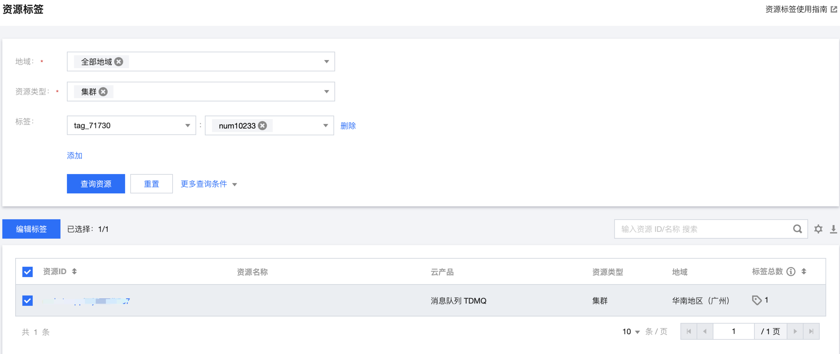 2. 在左侧导航栏选择资源标签,根据需要选择查询条件,并在资源类型中选择消息队列 TDMQ > 集群。