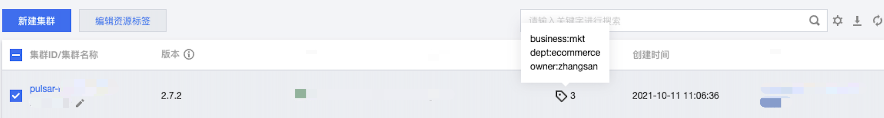 标签:owner:zhangsan 可筛选出绑定了标签键 owner:zhangsan 的集群。