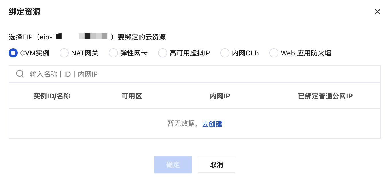 3. 在弹出的绑定资源窗口中,选择 EIP 要绑定的云资源类型、资源实例,单击确定。
