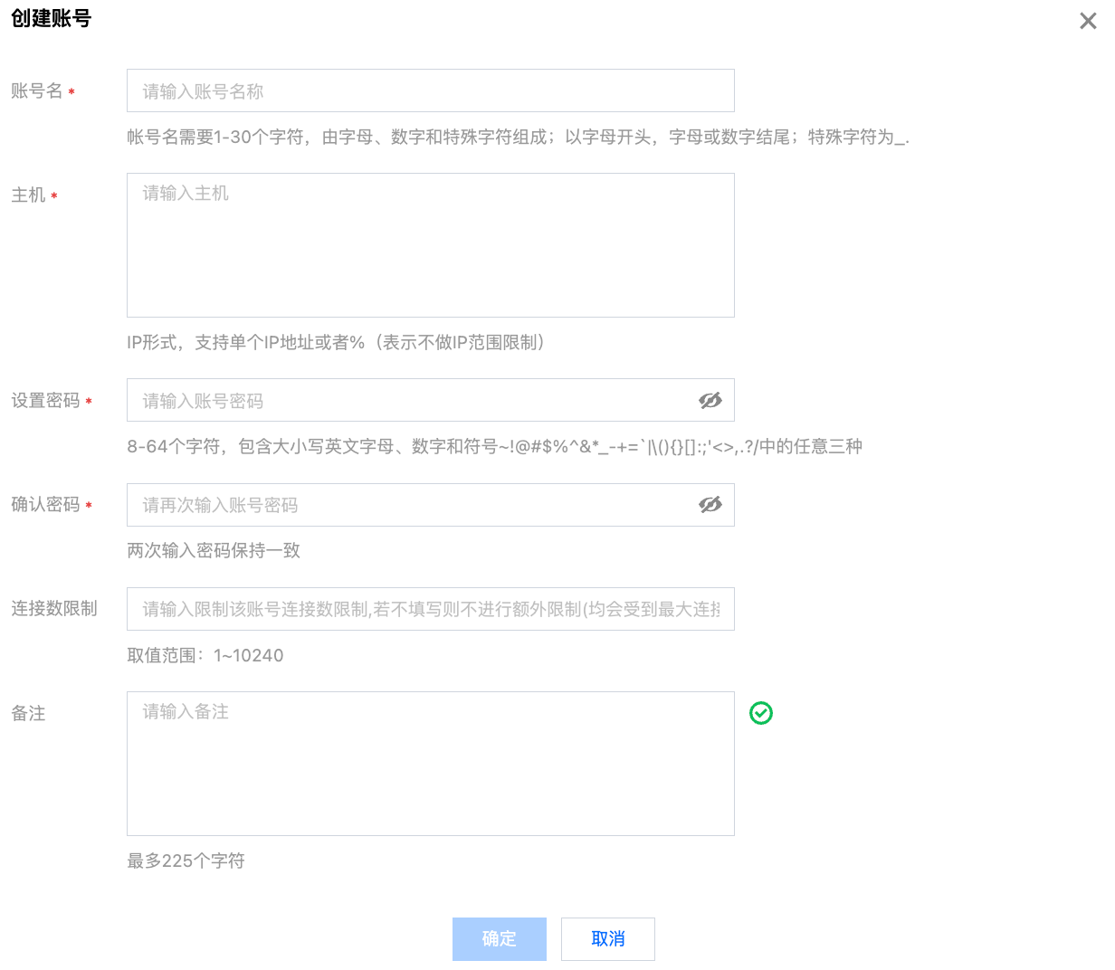 备注 | 为账号添加备注,最多可输入225个字符。 |