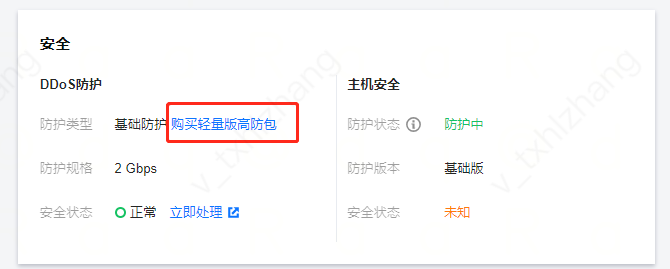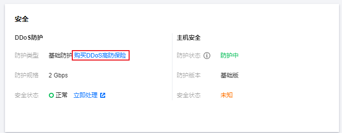 3. 在安全模块内,查看安全模块内 DDoS 防护,在此处选择购买 DDoS 高防保险或 DDoS 高防包(轻量版)。