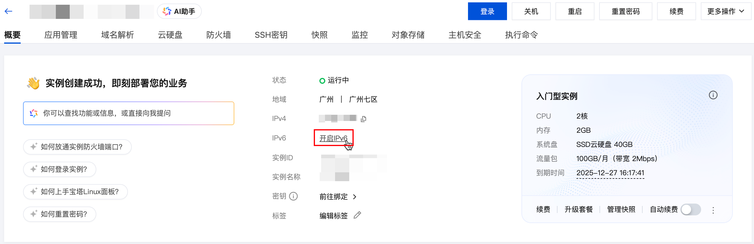 将光标移至实例卡片中的 IPv6 处,单击开启。