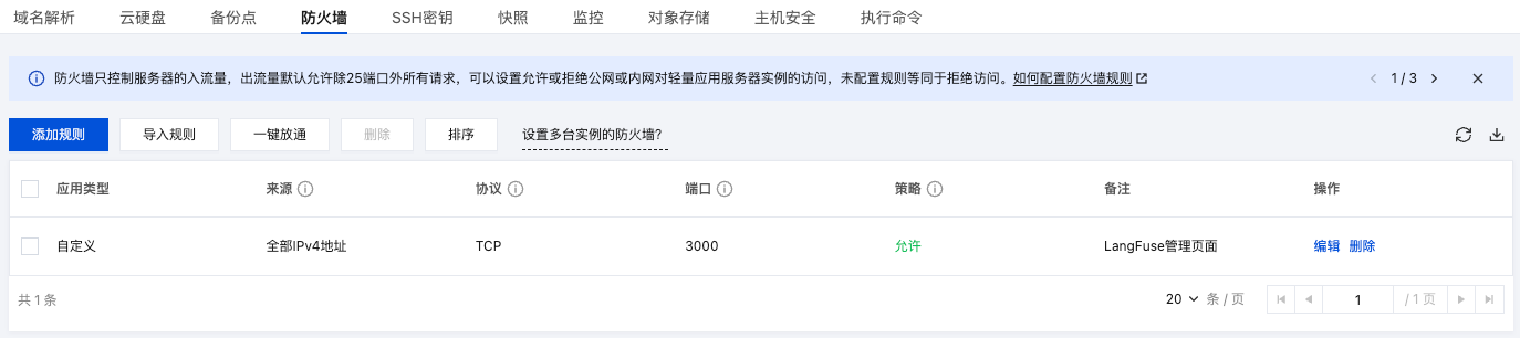 1. 访问 Langfuse 的应用页面前,需在实例详情页的防火墙页签检查是否已开放 TCP 协议 3000 端口。若未开放,请单击添加规则,开放 3000 端口即可。