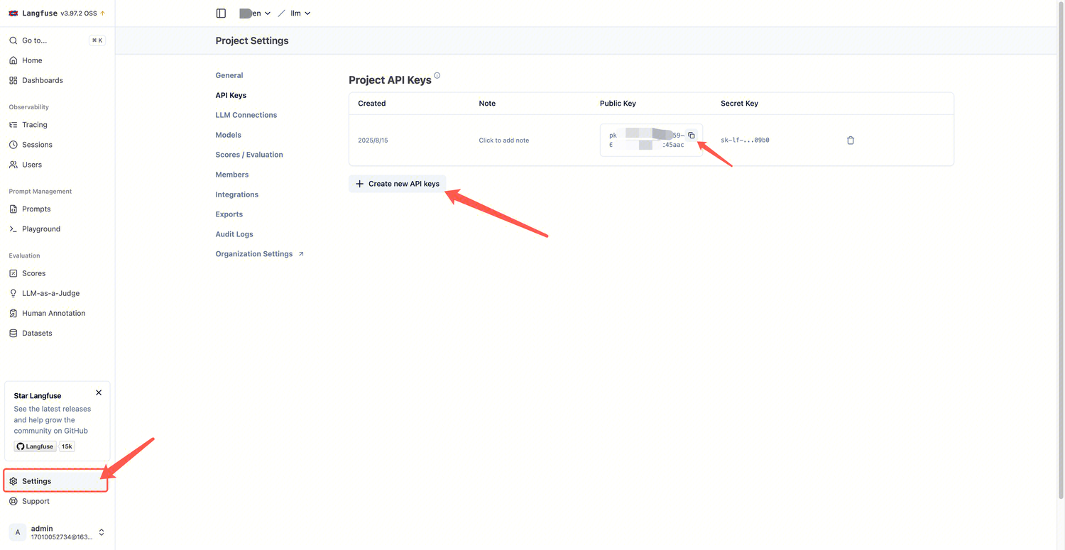 )。进入您刚才创建的项目,在 Settings - API Keys 页面找到以下三项关键信息:Secret Key