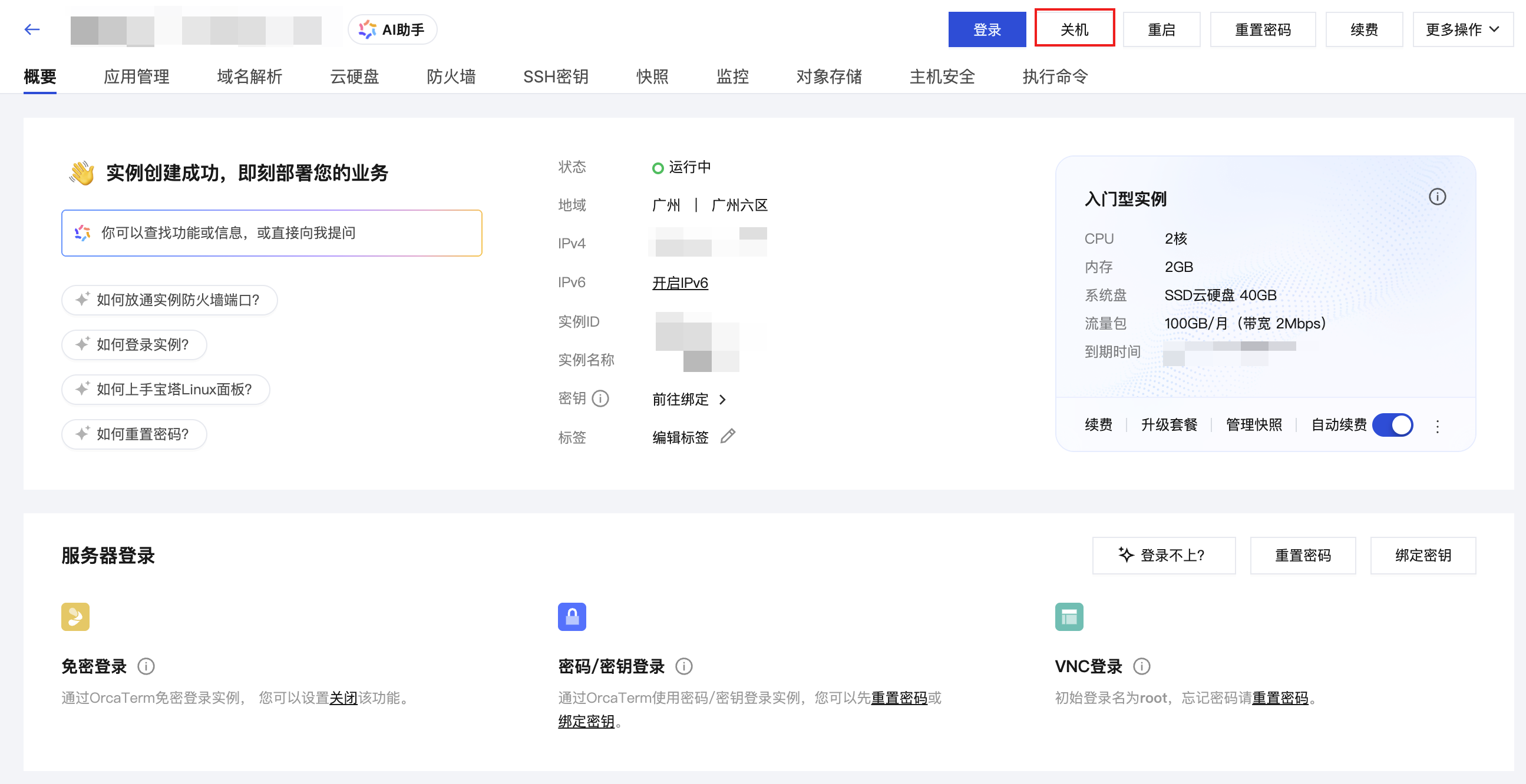 进入服务器详情页,单击页面右上角的关机。如下图所示: