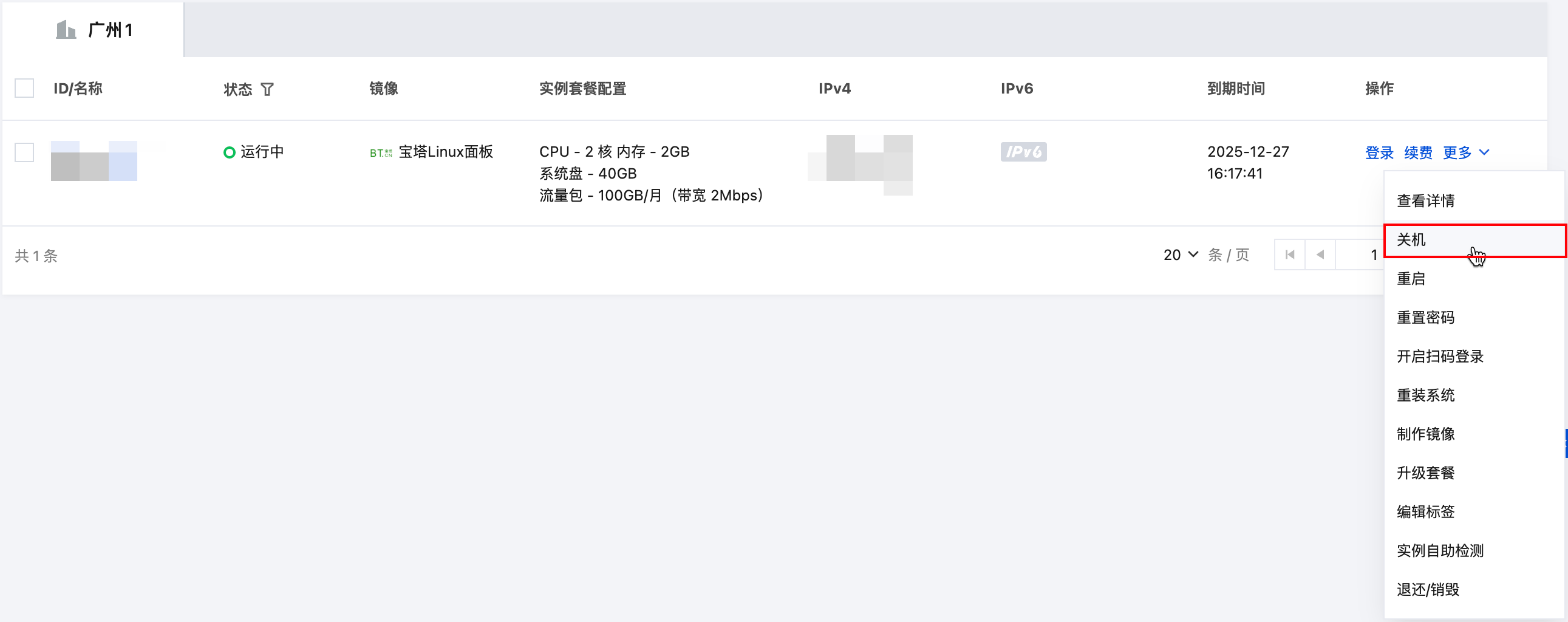 2. 在服务器列表中找到对应的实例,并根据实际的操作习惯选择不同的方式进行关机。