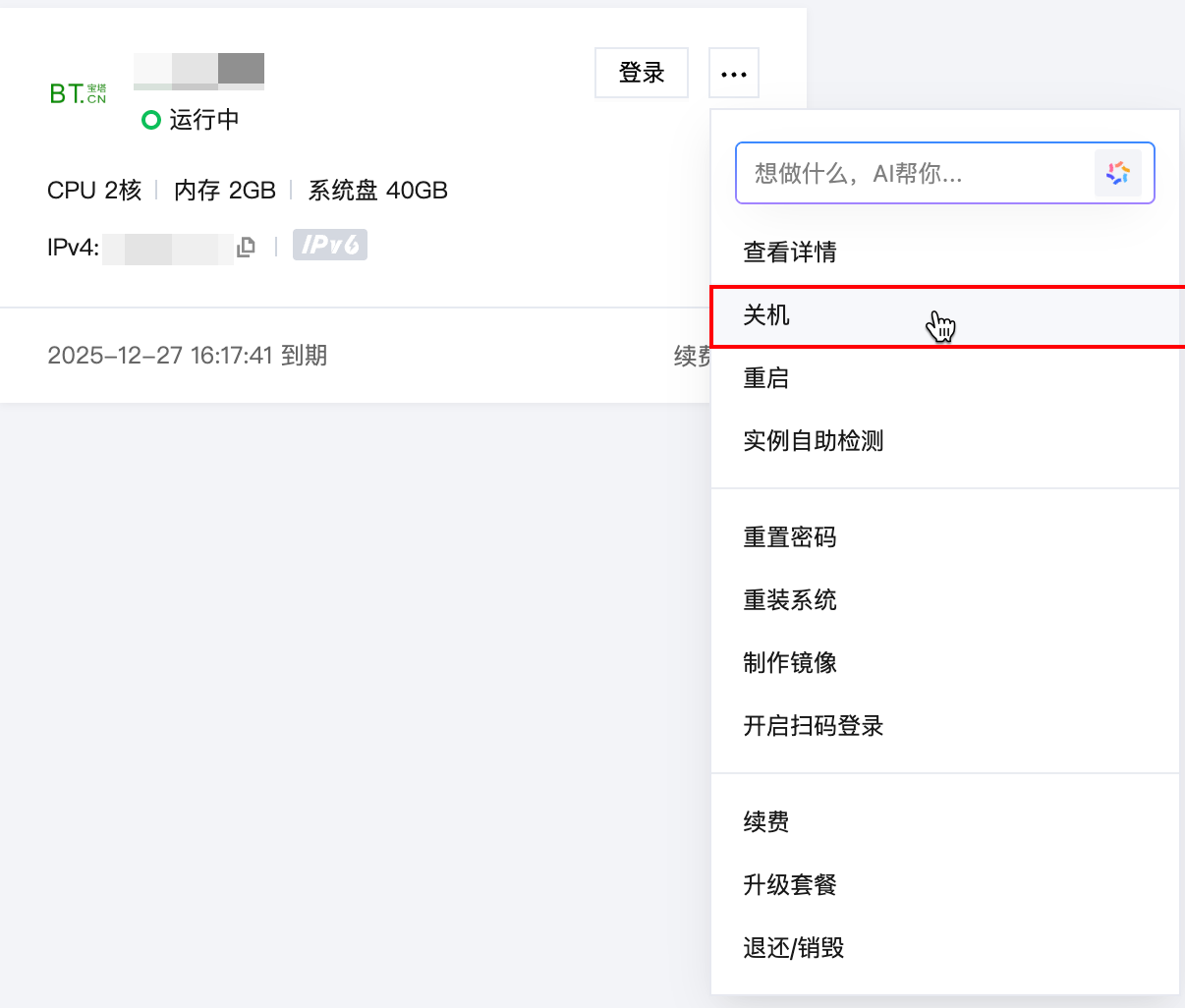 在服务器的实例列表中,单击需关机的实例右侧的更多 > 关机。如下图所示: