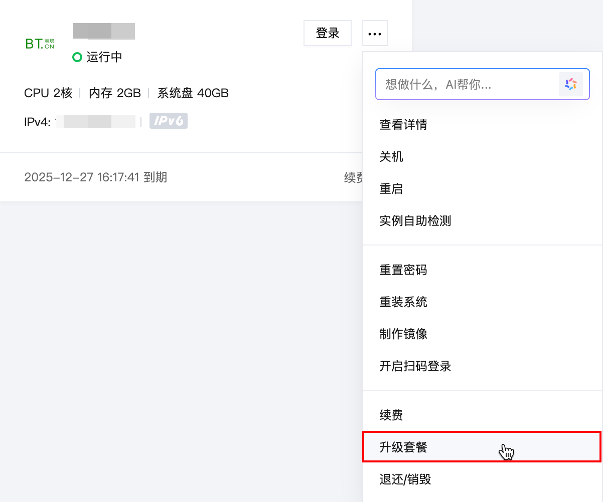 在服务器实例列表中,选择待升级套餐实例右侧的更多 > 升级套餐。如下图所示: