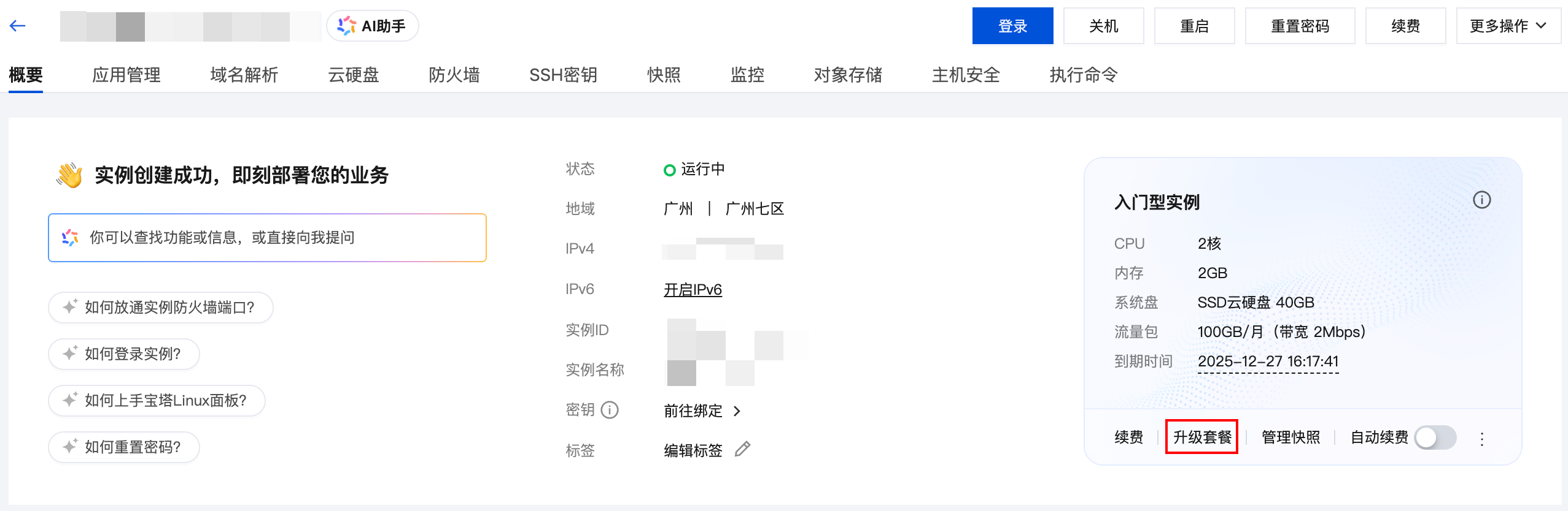 2. 在实例信息中单击升级套餐。如下图所示: