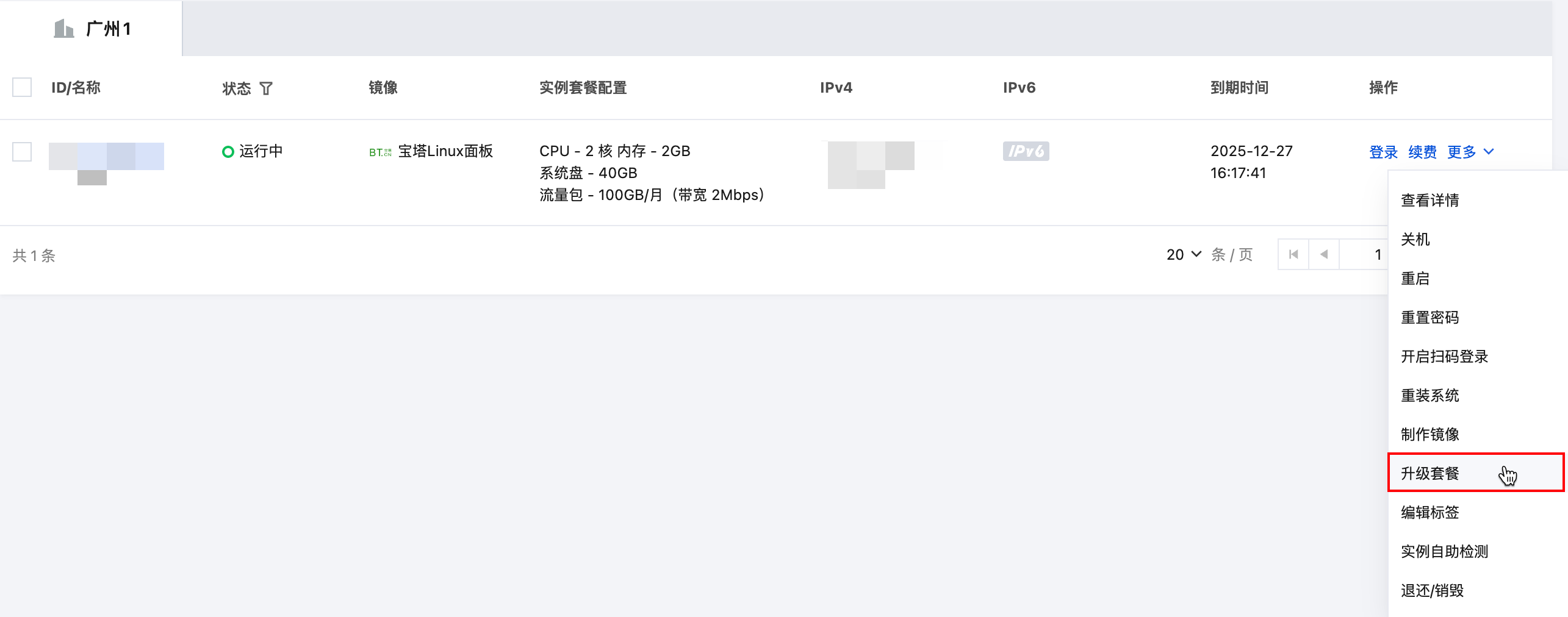 在服务器列表中,找到待升级套餐实例,选择