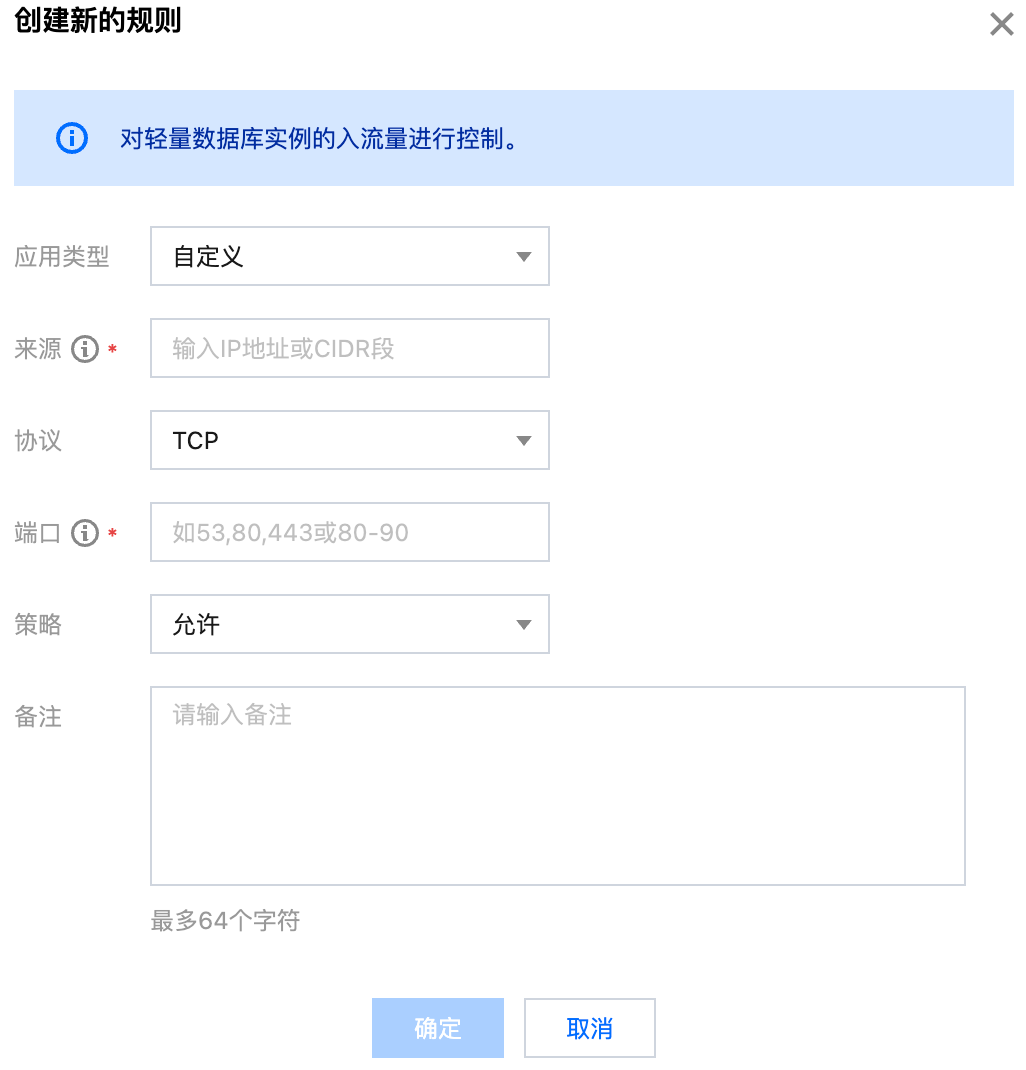 在轻量数据库中,支持配置防火墙规则来控制访问权限,进行网络隔离以增强安全性。如果不配置防火墙规则,则表示不限制访问数据库的来源,未经授权的访问也可连接数据库。如果配置防火墙规则,限制了来源、协议以及端口,例如:配置来源为172.1.4.12、协议为TCP、端口为45,访问策略为允许,则表示仅允许来源为172.1.4.12,来自 TCP 协议且端口号为45的应用访问轻量数据库。