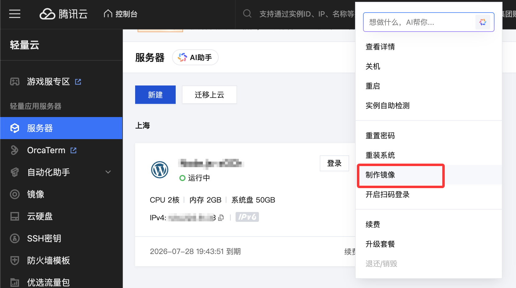在服务器实例列表中,找到需要创建自定义镜像的轻量应用服务器,选择更多 > 制作镜像。如下图所示: