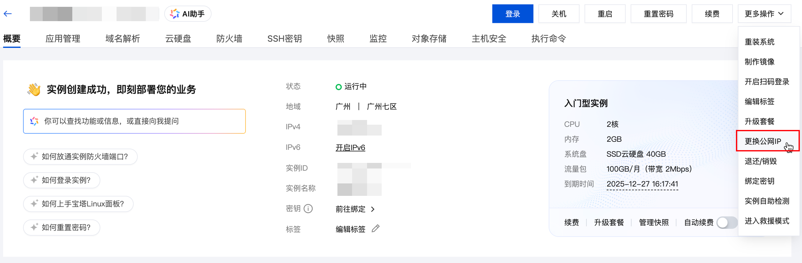 2. 在实例详情页中,选择右上角的更多操作 > 更换公网 IP。如下图所示: