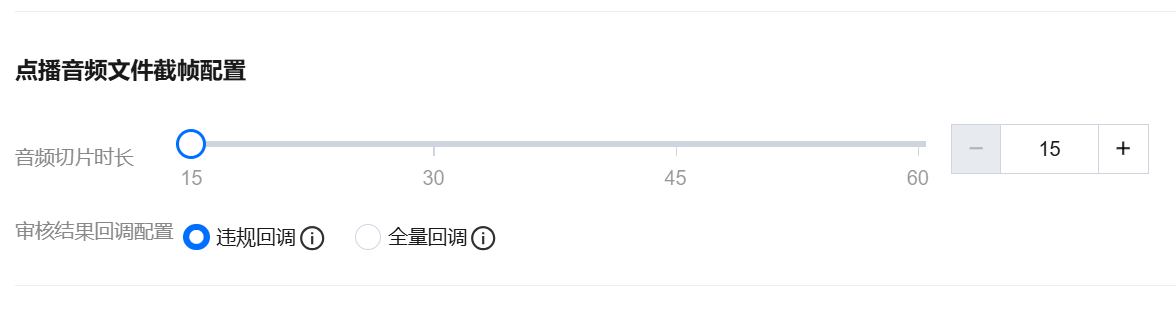 点播音频文件截帧配置 | 音频切片时长:设置音频切片的时间长度,可选15s、30s、60s,也可自行填写设置,默认为30s。 审核结果回调配置: 违规回调:仅返回违规审核结果。 全量回调:返回全部审核结果。 |