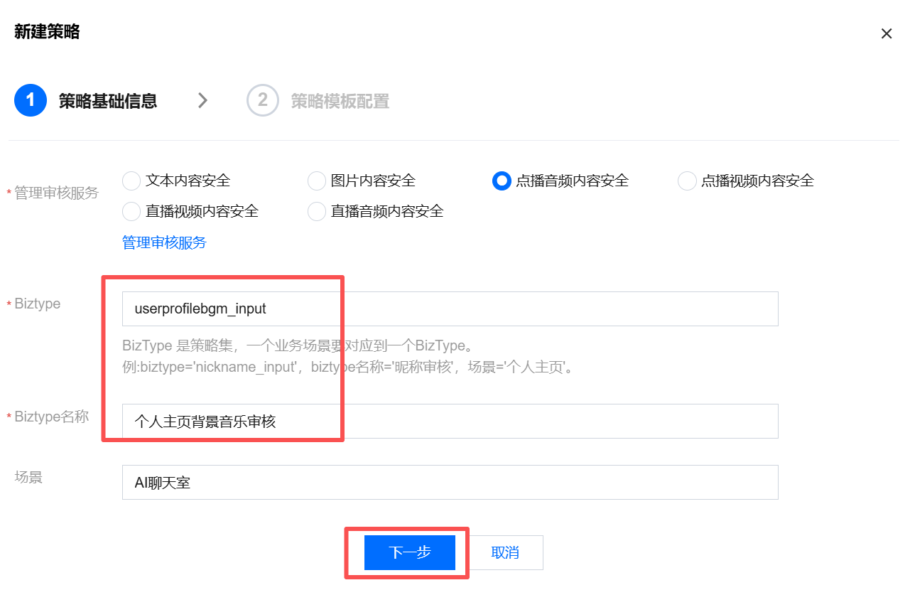 4. 在新建策略页面,选择点播音频内容安全,输入Biztype、Biztype名称、场景,单击下一步进入策略模板配置。