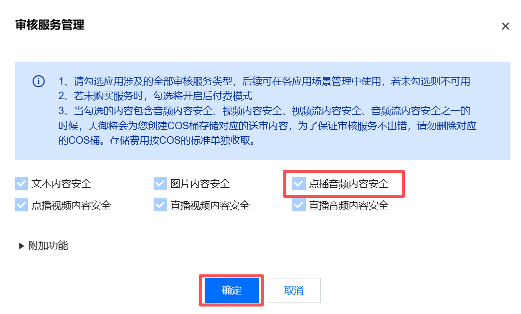 2. 弹窗审核服务管理,选择点播音频内容安全服务,单击确定即完成开通。