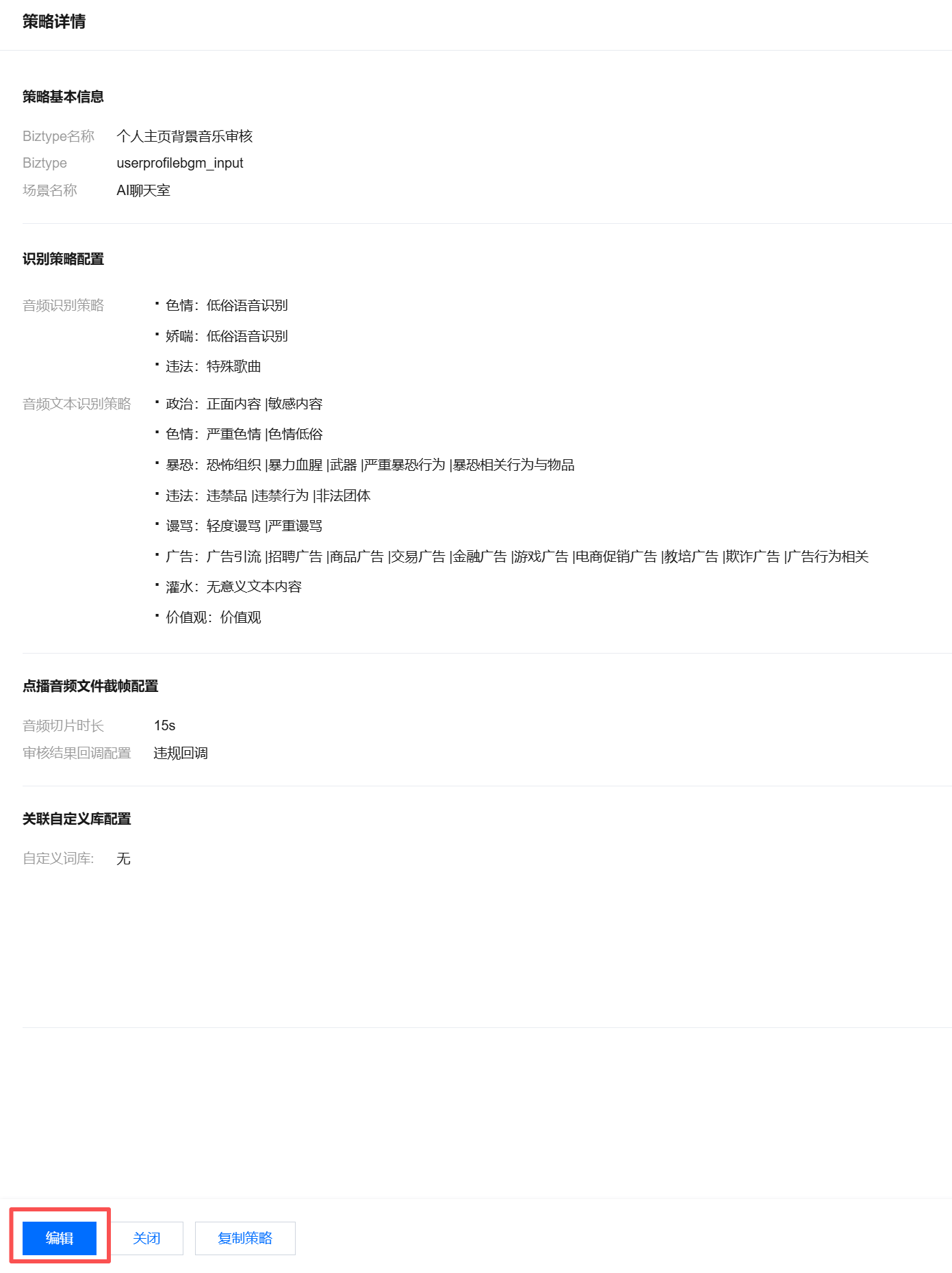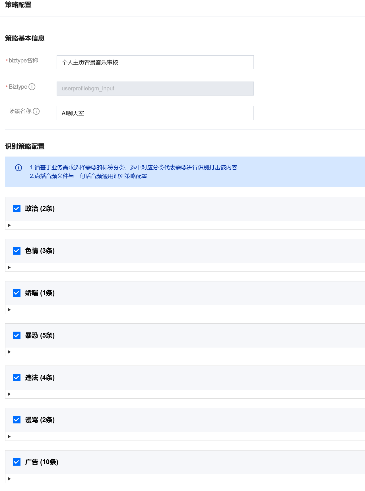单击确认引用模板后,策略配置页面会刷新成对应的标签和音频识别模板配置(如色情、违法、广告等)。