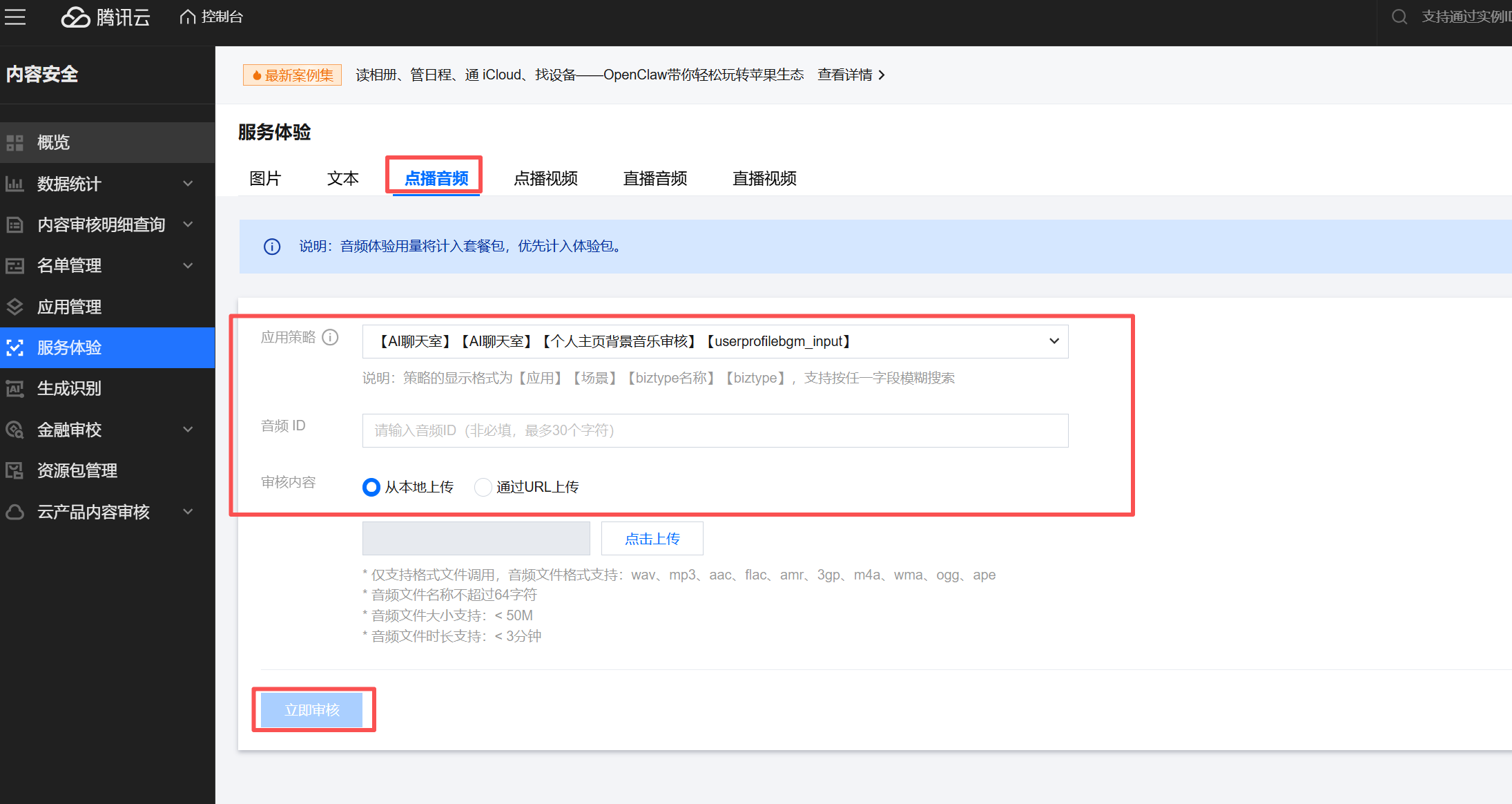 1. 登录 内容安全控制台,在左侧导航栏单击服务体验,在服务体验页面选择点播音频。