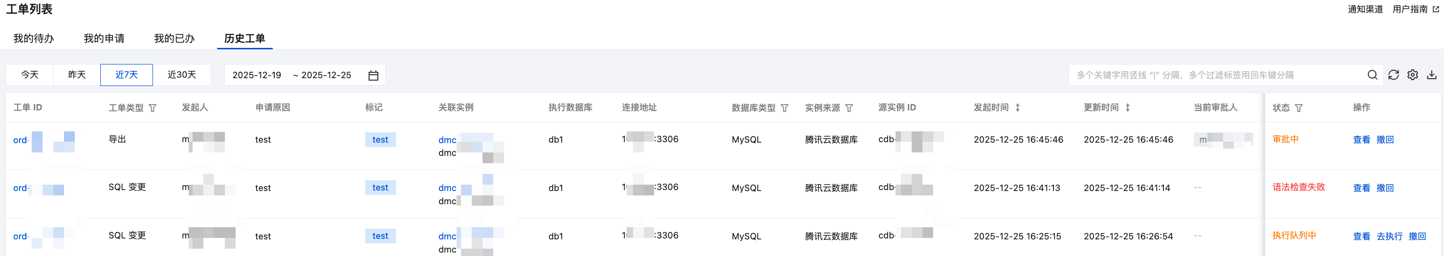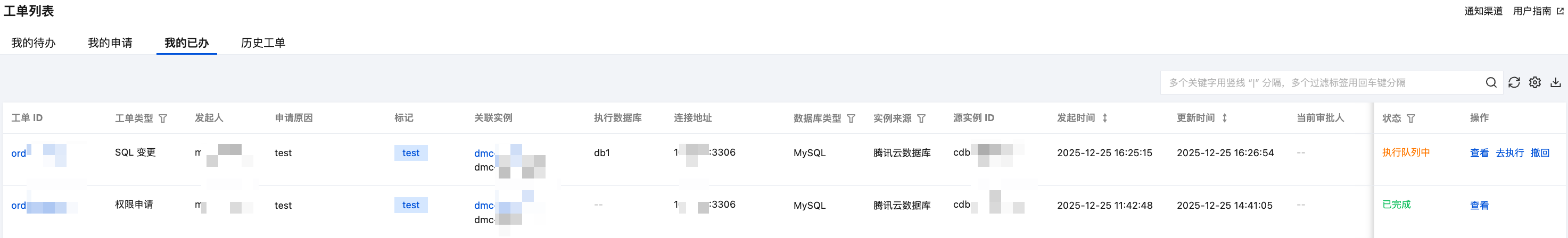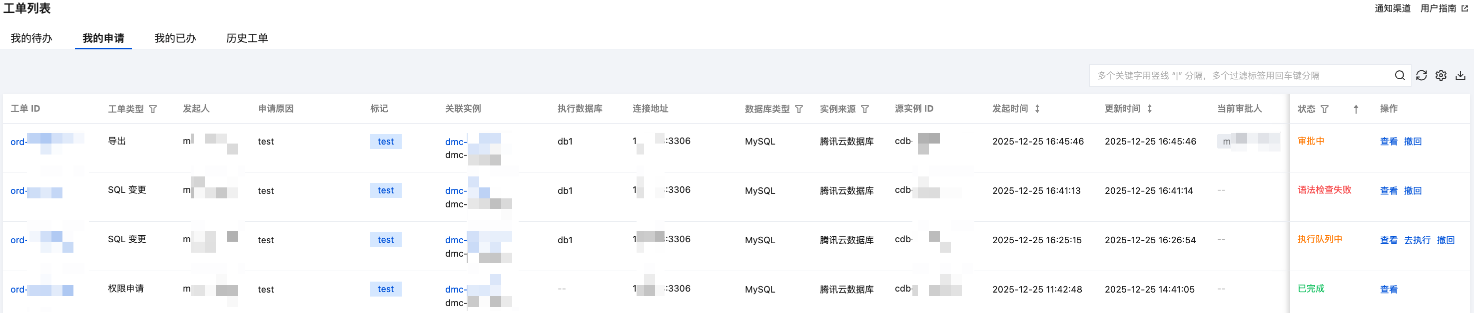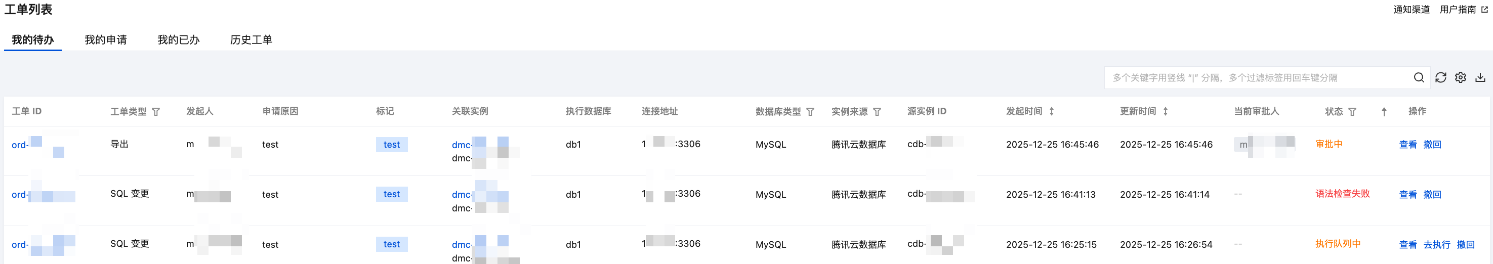 工单状态 | 包括以下状态: 语法检查中:表示提交工单申请后,进入 SQL 语法检查阶段。 语法检查失败:表示 SQL 语法存在错误,请在工单列表操作列单击查看或单击工单 ID,查看和修改工单。 语义分析中:表示 SQL 语法检查成功,进入 SQL 语义分析阶段。 语义分析失败:表示 SQL 存在强制改进项,请在工单列表操作列单击查看或单击工单 ID,查看和修改工单。 审批中:表示工单已完成语法检查和语义分析,进入审批阶段,请耐心等待。 已驳回:表示提交工单申请被驳回,请在工单列表操作列单击查看或单击工单 ID,单击审批信息,查看驳回原因。 执行队列中:表示已审批通过。 若提交工单申请时执行方式选择自动执行,稍作等待状态变更为执行中。 若提交工单申请时执行方式选择定时执行,待到达执行时间点后稍作等待待状态会变更为执行中。 若提交工单申请时执行方式选择手动执行,请在工单对应操作列单击去执行。 执行中:表示正在执行 SQL 变更、数据导入、数据导出或开放权限。稍作等待即可产生执行结果。 已终止:表示正在执行中的工单被手动终止。 执行失败:表示预执行 SQL 失败。请在流程管理 > 执行列表 > 执行历史页面的状态列查看失败原因,或在操作列单击查看查看工单详情和失败信息。 已取消:表示工单已撤回。 已完成:表示工单执行成功。 |