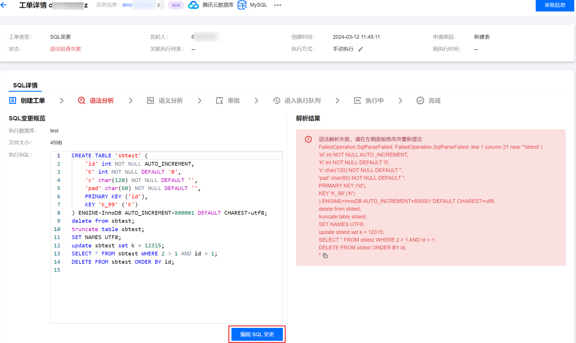 若工单处于语法检查失败、语义分析失败状态,可单击编辑 SQL 变更、编辑导入设置或编辑导出设置,修改语法或语义错误。
