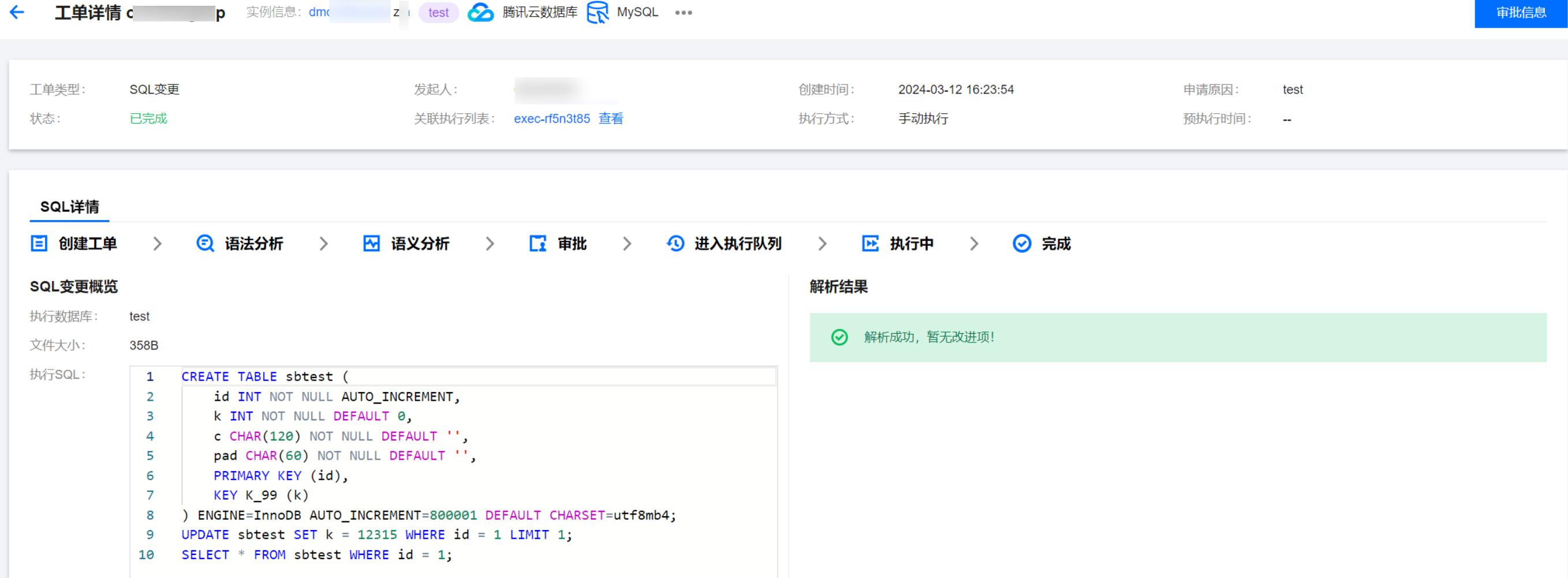 5. 在工单详情页面查看工单详情、工单状态、SQL 详情、审批信息等信息。