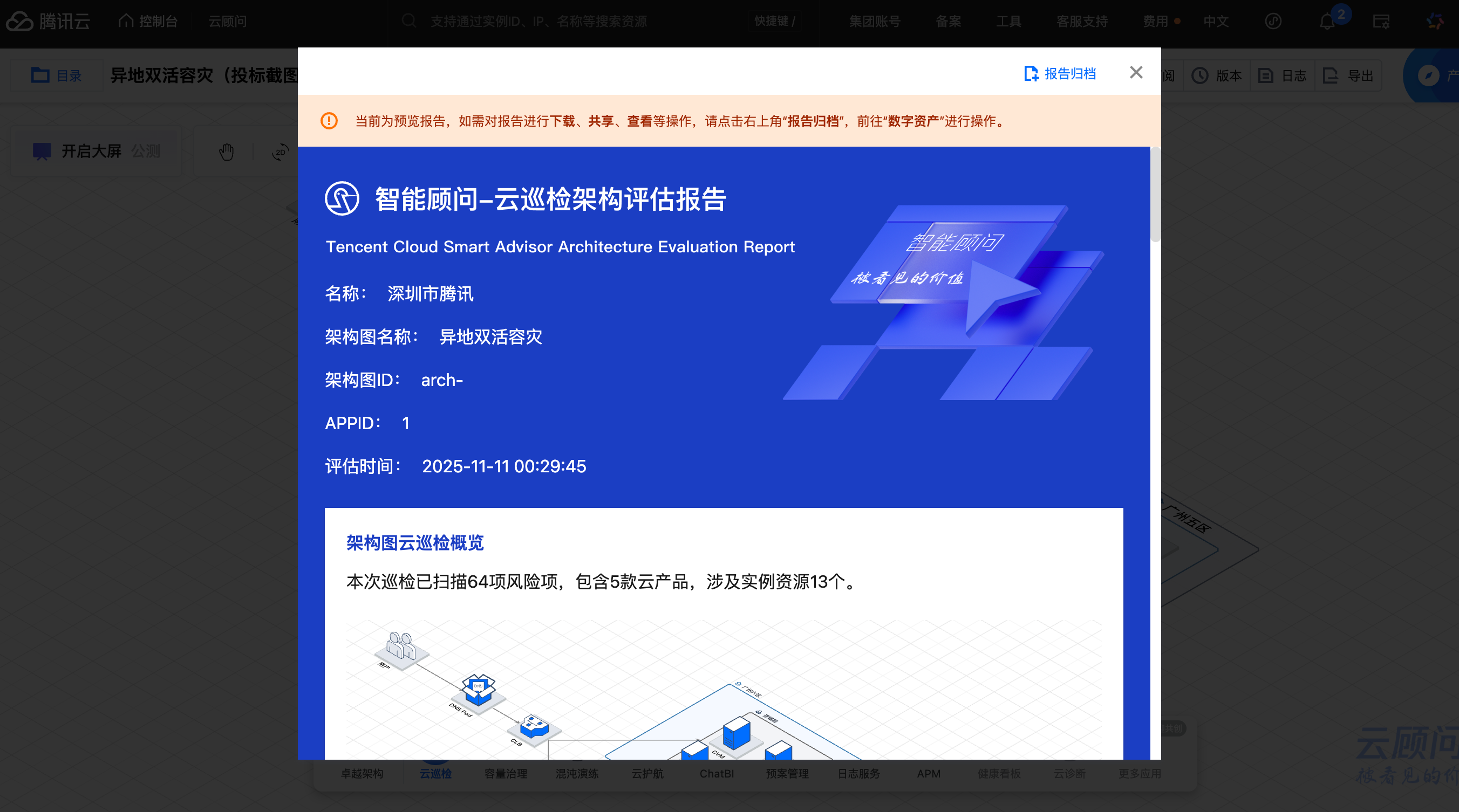下载 PDF 云巡检架构评估报告:单击在线报告右上角的报告归档,架构评估报告将会被归档至数字资产页面,可以在数字资产页面进行查看、下载、共享和删除操作。