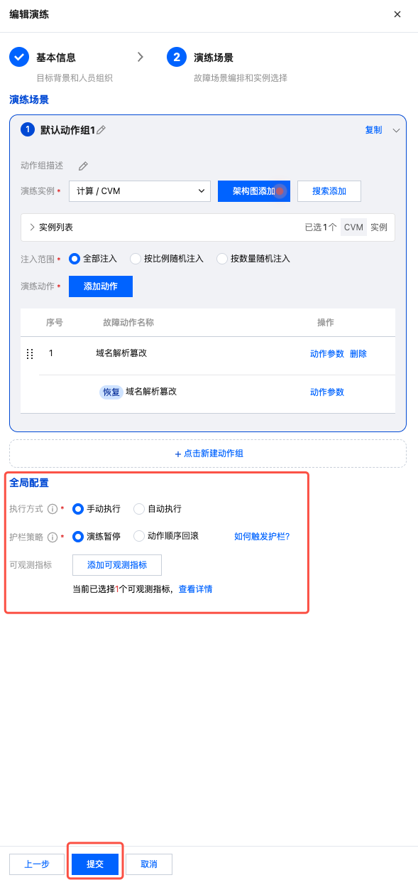 6. 参数配置完成之后,在全局配置中选择执行方式、护栏策略,及添加可观测指标。配置完成后,点击提交,即可完成演练任务创建。