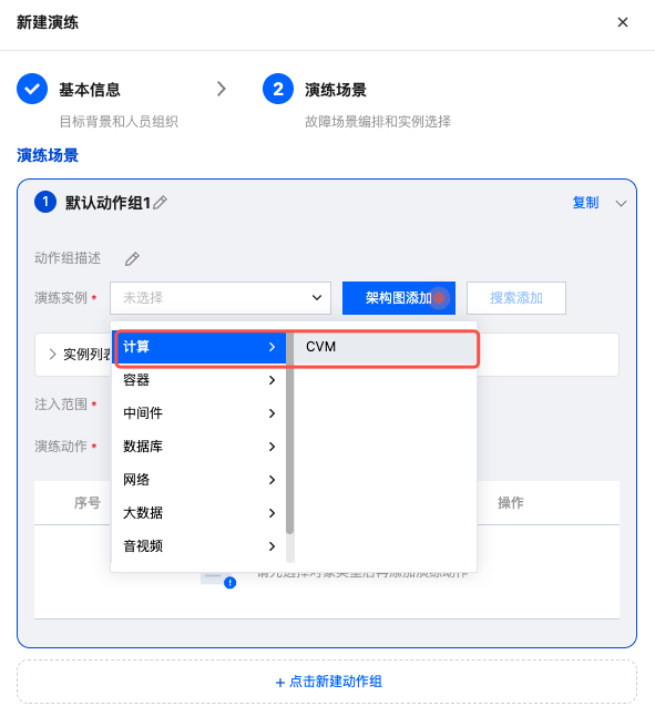 3. 在演练实例中,选择计算- CVM,选择后点击搜索添加,添加 CVM 实例资源。亦可通过架构图添加方式,直接点击架构图上的 CVM 资源,选择实例进行添加。