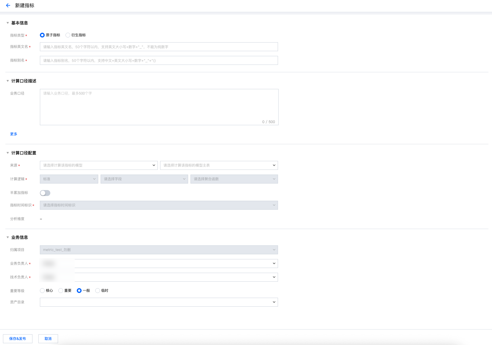 4. 配置完上述指标信息后,可单击“保存&发布”按钮,即可发布指标。此处注意:如果当前项目开启了指标发布审批流程,则需要经过审批后方可发布成功;如果该项目没有开启指标发布审批流,审批流直接发布成功,