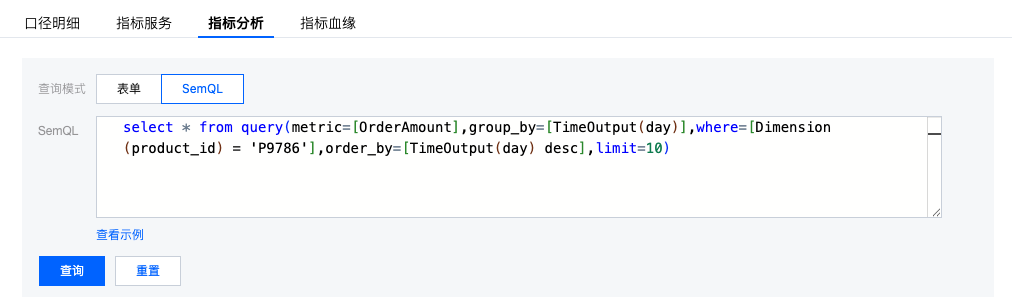 #场景1: 查询指标按指定维度输出,其中OrderAmount为指标编码,product_id为维度编码,TimeOutput(day)表示时间序列按天粒度输出,如果需要按月、年则可替换为TimeOutput(month)或TimeOutput(year)。select * from query(metric=[OrderAmount],group_by=[TimeOutput(day)],where=[Dimension(product_id) = 'P9786'],order_by=[TimeOutput(day) desc],limit=10)#场景2: 查看查询语句生成的sql,注意,只需要对所有查询语句后,添加compiler=true,即可获取该查询语句对应的查询sql。select * from query(metric=[OrderAmount],group_by=[TimeOutput(day)],where=[Dimension(product_id) = 'P9786'],order_by=[TimeOutput(day) desc],limit=10,compiler=true)#场景3: 字典维度和时间维度作为where条件查询指标。其中:其中latest30DaysOrderAmount为指标编码,product_type为维度编码,event_date为时间维度编码。select * from query(metric=[latest30DaysOrderAmount],group_by=[TimeOutput(day)],where=[Dimension(product_type) = 'electronic' and(TimeDimension(event_date,day)>='2025-01-01' AND TimeDimension(event_date,day)<='2025-01-31')],order_by=[TimeOutput(day) desc],limit=10)