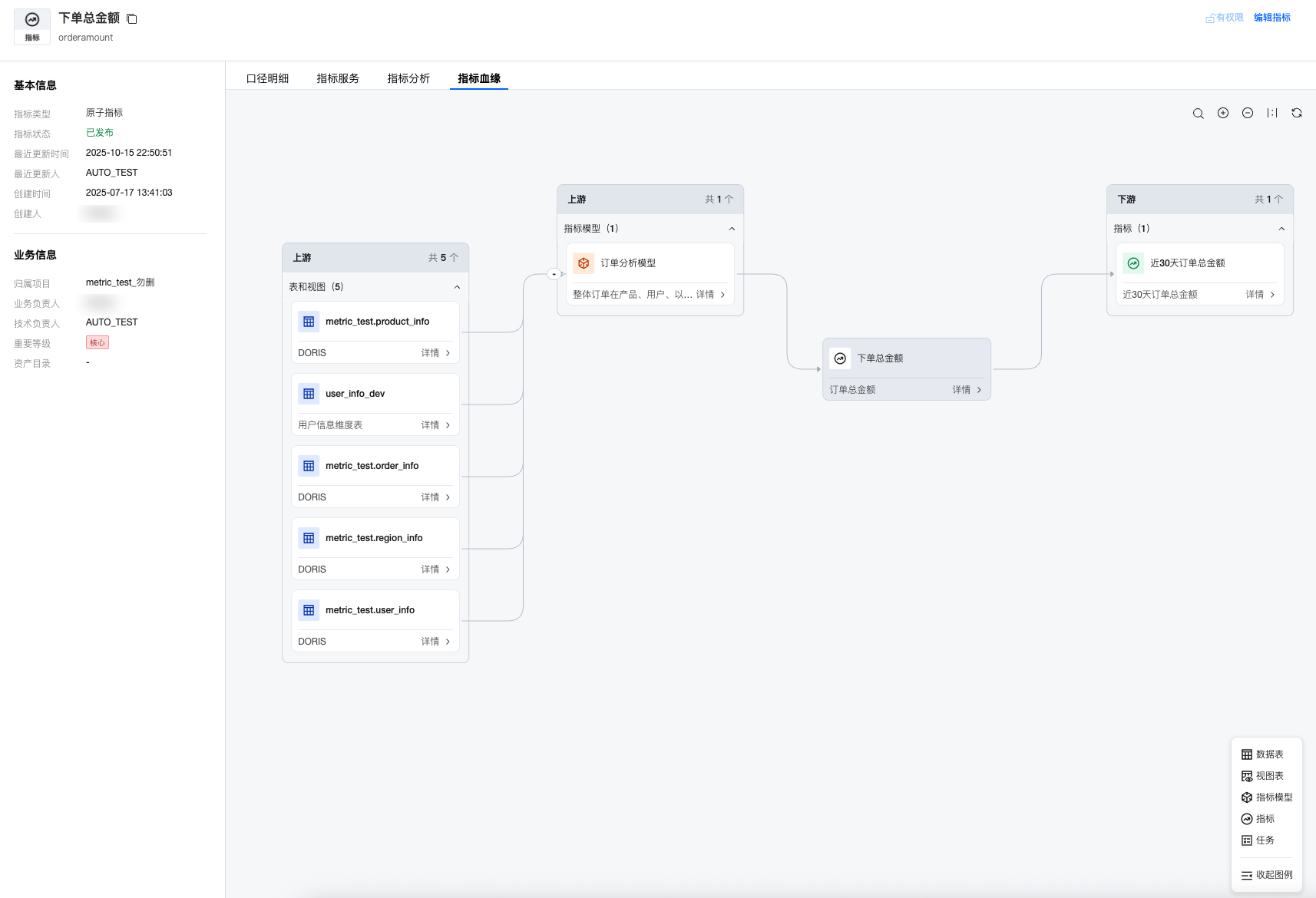 3. 选择目标指标,单击后可进入指标详情页面,查看指标基本信息、业务信息、口径明细以及指标血缘等信息。