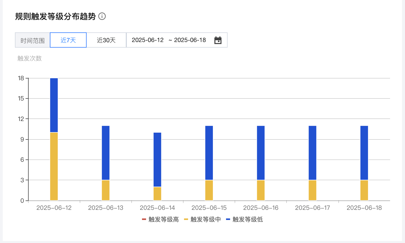 鼠标悬停至柱状图中可展示出每天的规则触发等级分布具体数值。