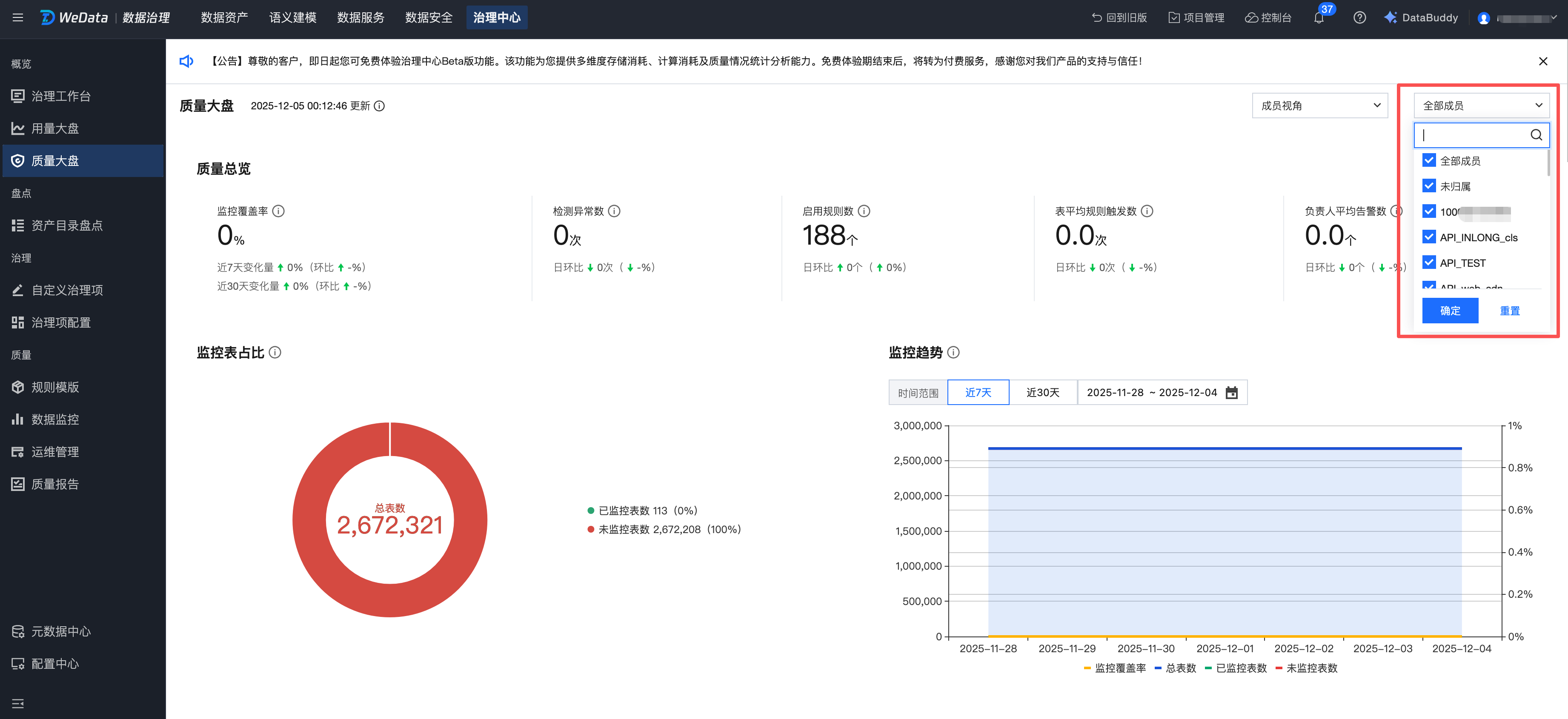 成员视角:支持查看指定的成员负责的表的质量监控,默认为全部成员,支持多选。“未归属”,用以筛选负责人为空的数据。