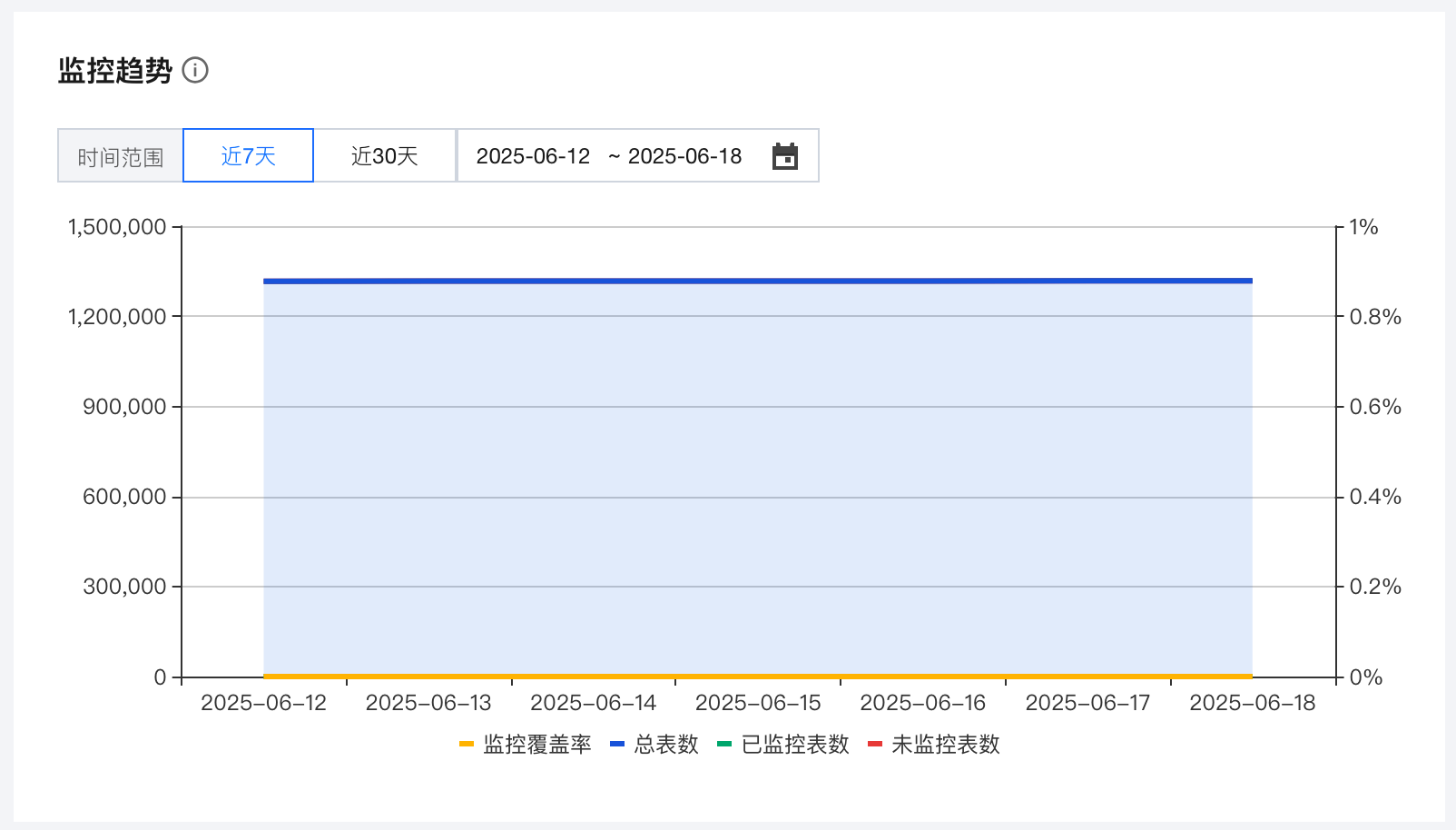 展示所选时间范围内,按天为粒度的监控覆盖率具体情况,包括总表数以及已监控表数;同时,支持您按照时间区间快速筛选。