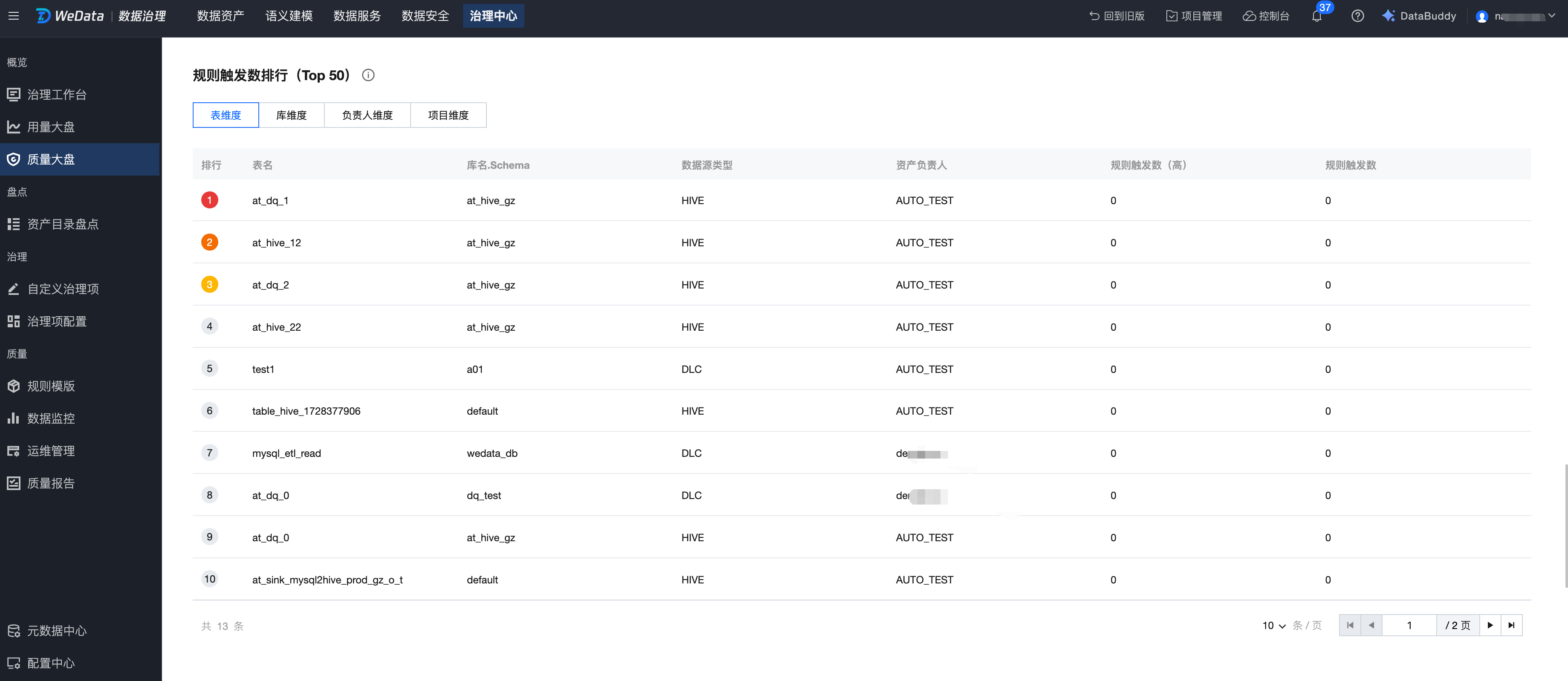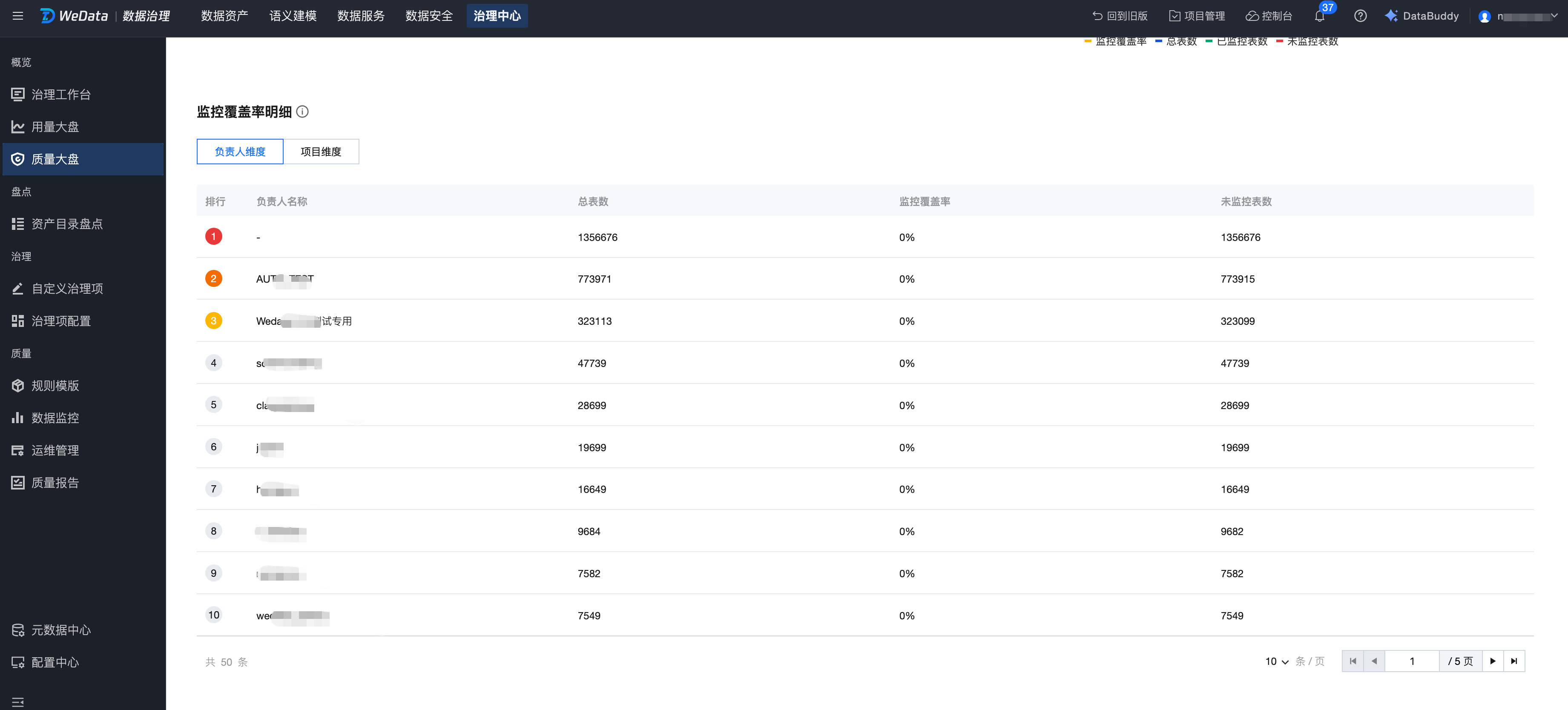 统计直至昨天,按照负责人/项目粒度聚合的监控覆盖率数据共50条,默认按照未监控表数从高到低排序,支持按照负责人、项目维度排行