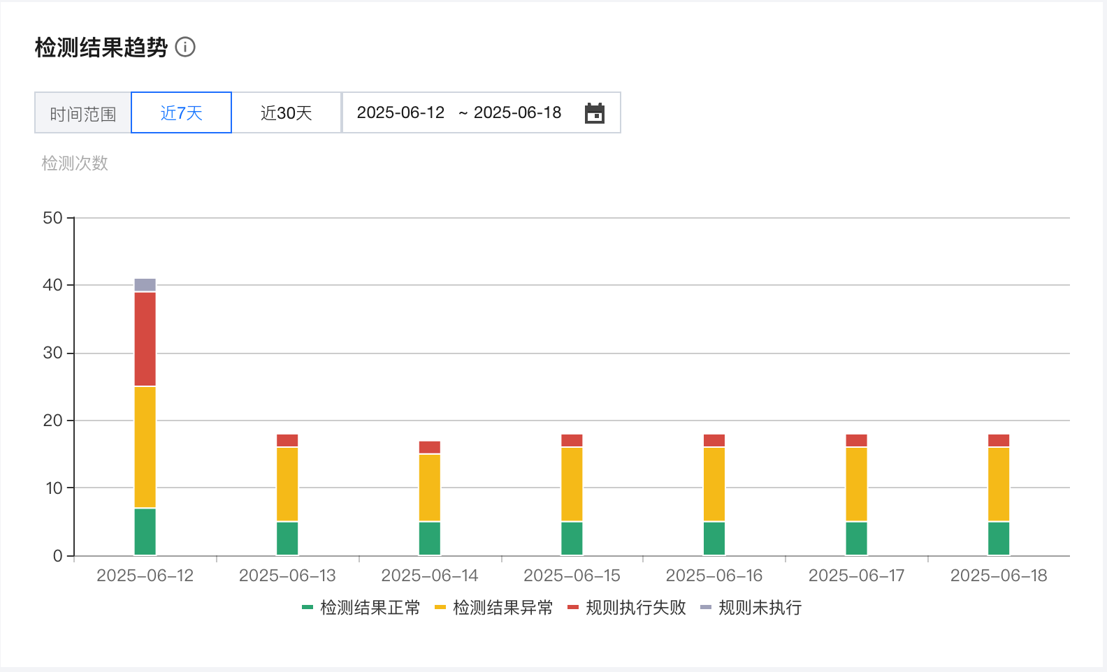 在所选时间范围内,所有规则执行后的检测结果分布趋势,同时,支持您按照时间区间快速筛选。