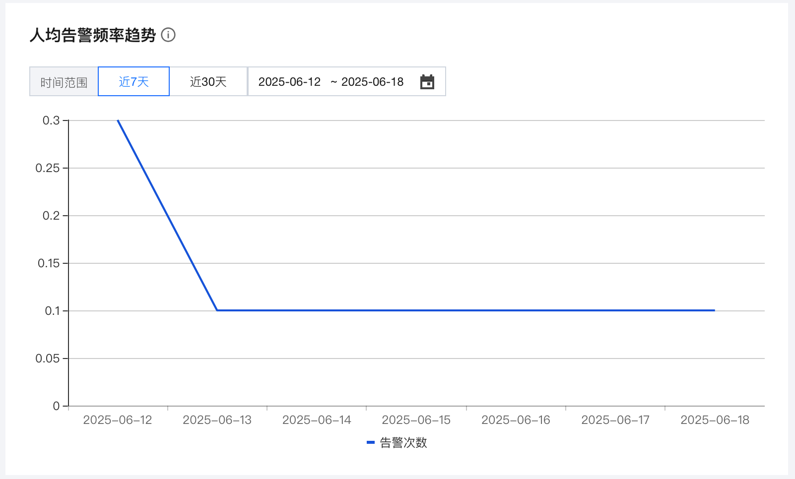 在所选时间范围内,按天为粒度聚合的人均告警数,同时,支持您按照时间区间快速筛选。