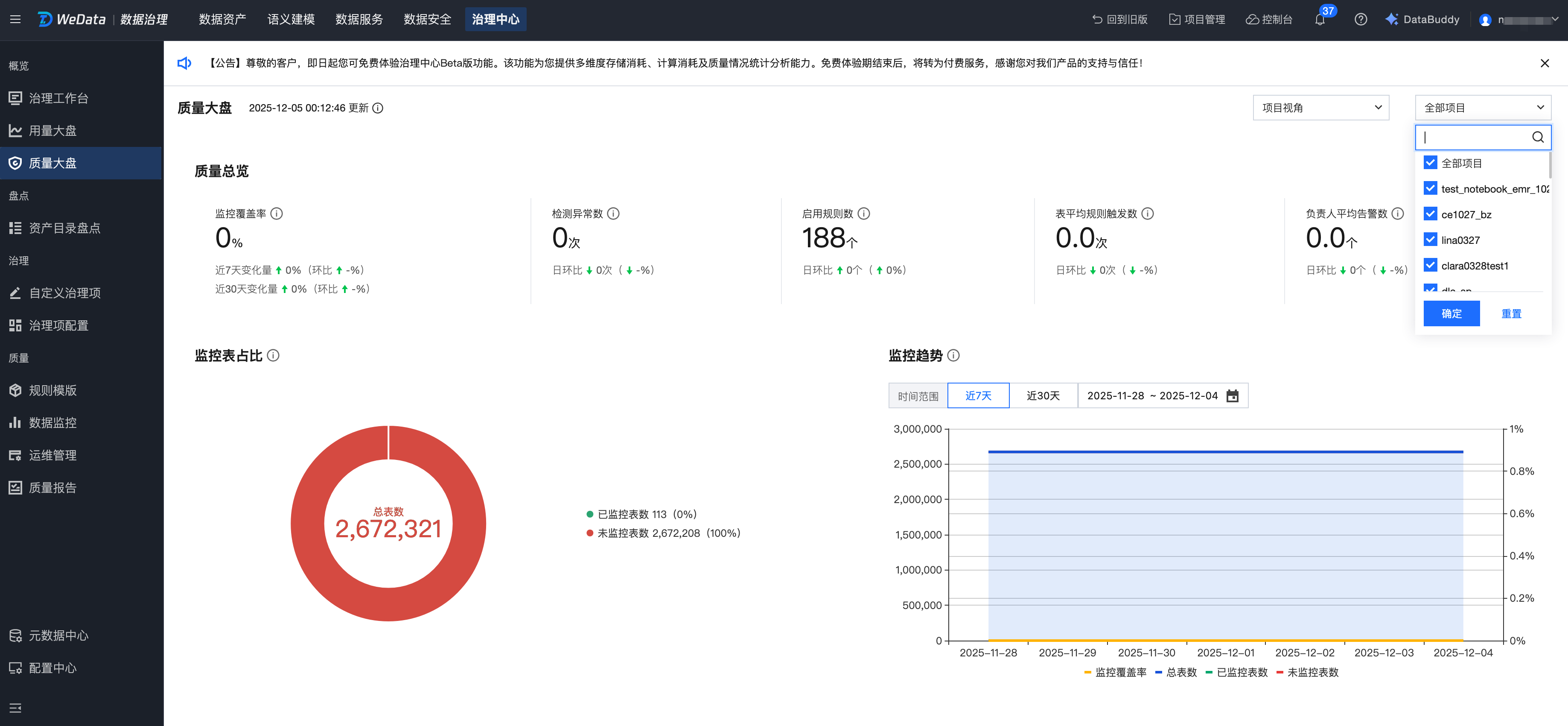 项目视角:支持查看指定项目的表的质量监控,默认为全部项目,支持多选。