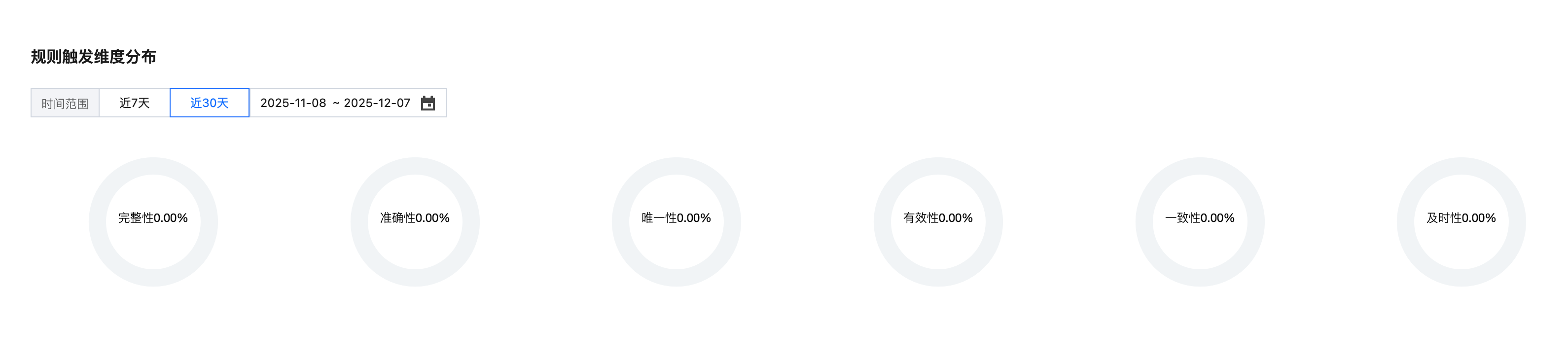 展示所选时间范围内规则触发的完整性、准确性、唯一性、有效性、一致性、及时性 六种维度的分布比例。同时,支持您按照时间区间快速筛选。