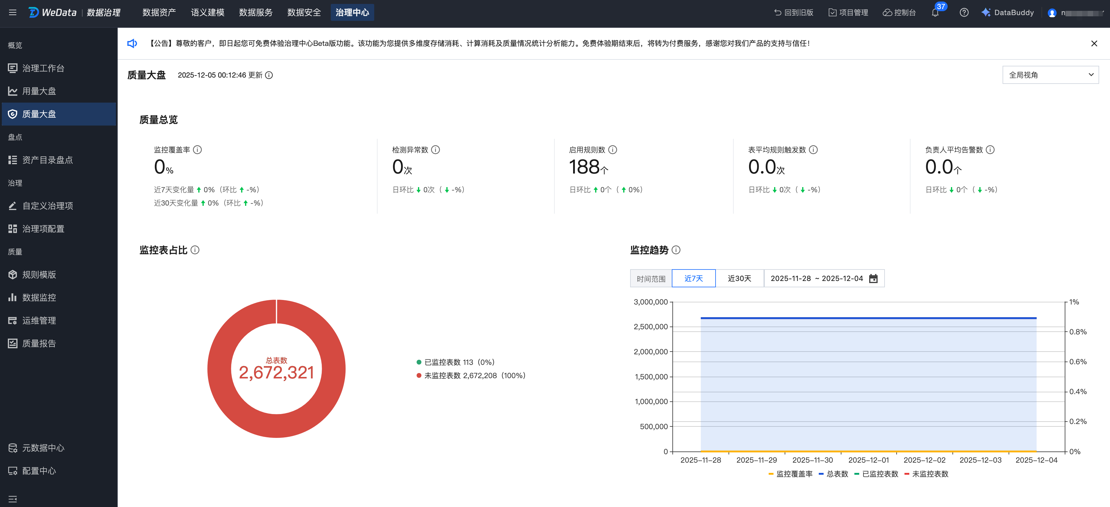 质量大盘主要展示表质量监控覆盖情况,质量检测结果各项数据指标及告警、阻塞趋势,便于用户全局掌握大盘质量情况,洞察数据质量的周期性变化,快速定位发现问题。