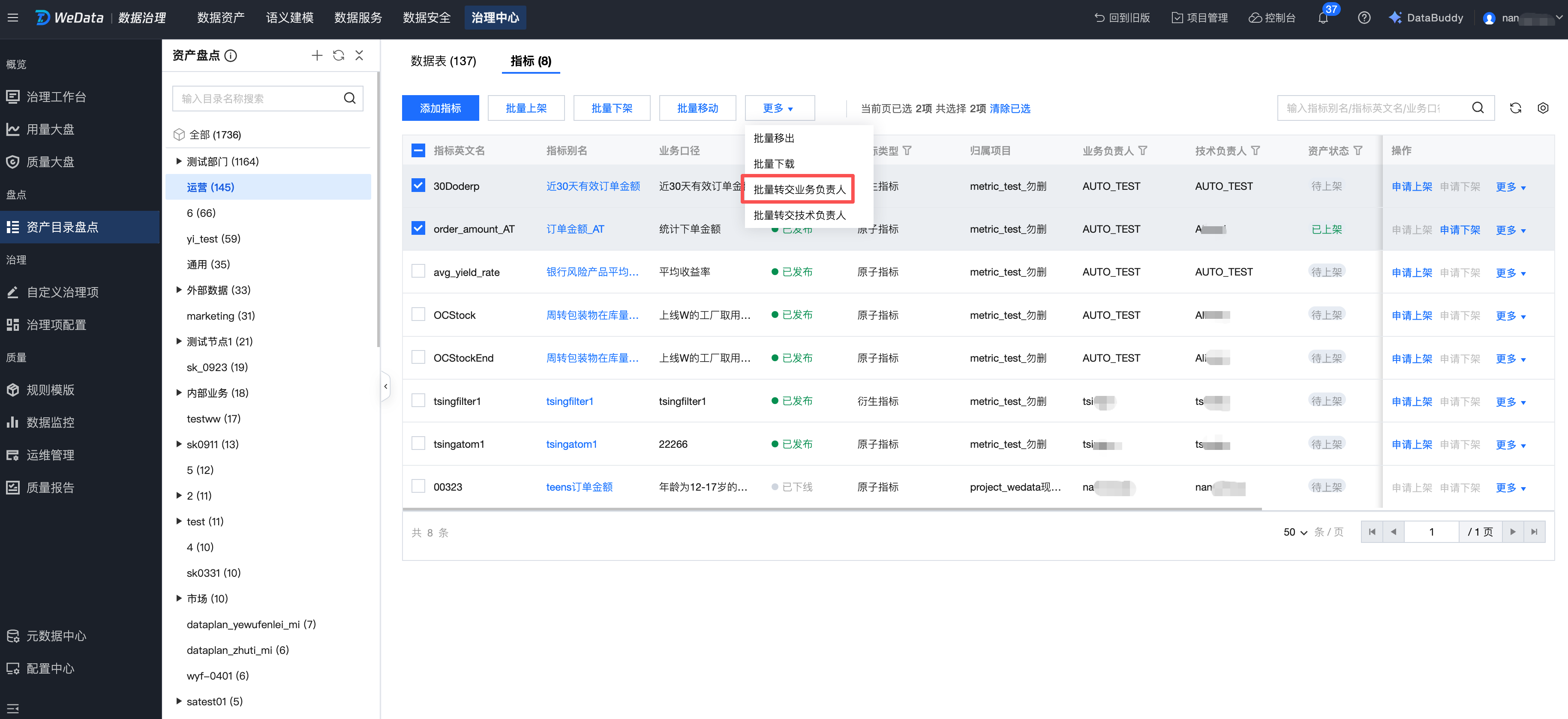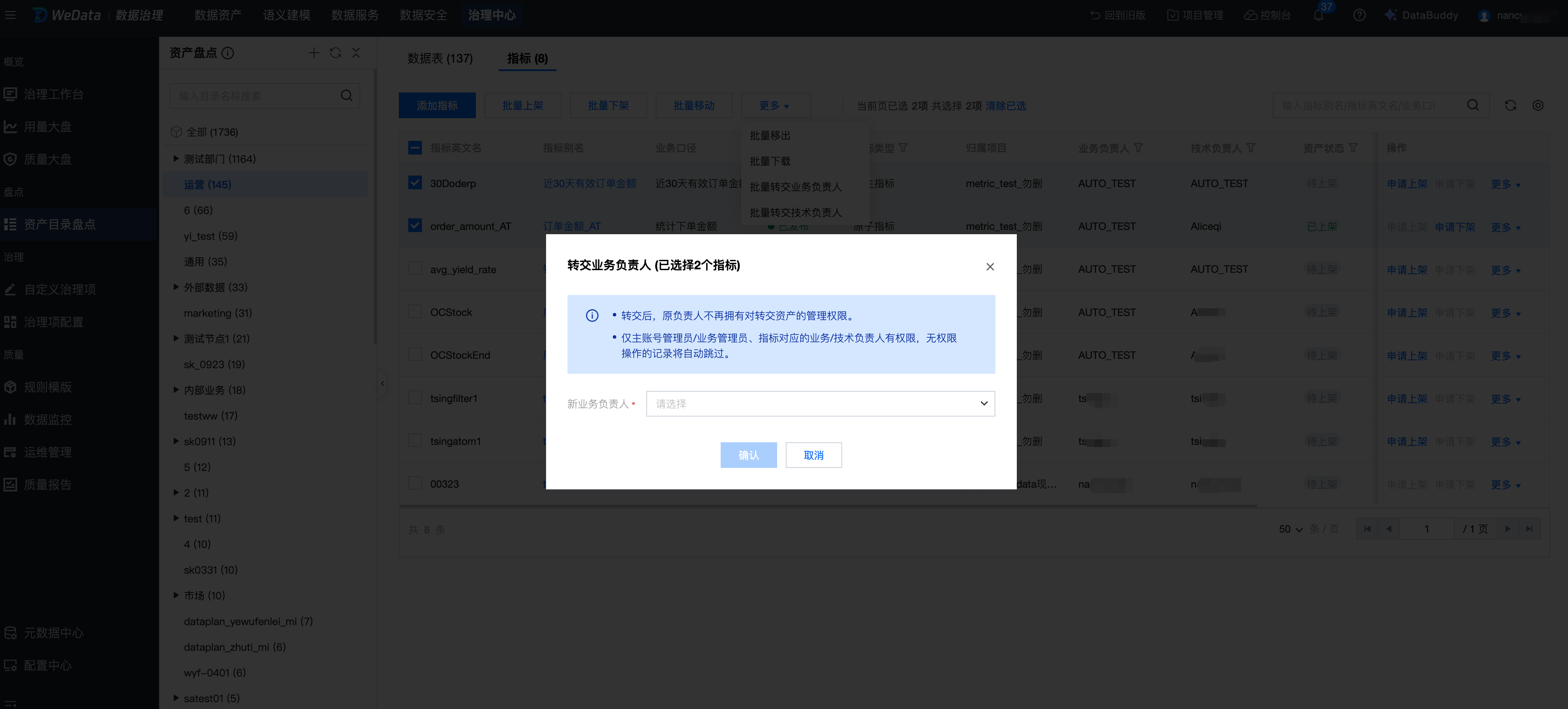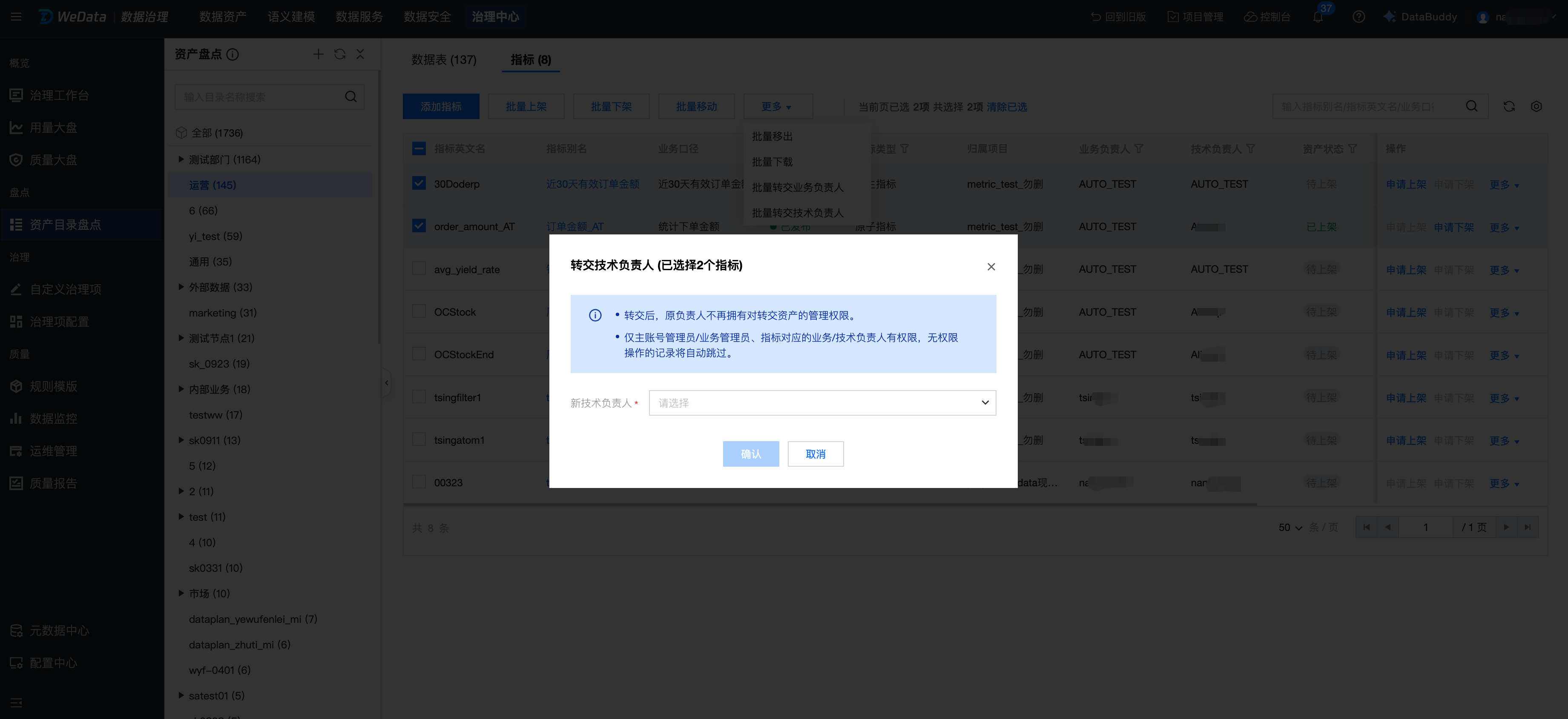 对指标的盘点:添加指标、移动(批量移动)指标、表上下架(批量上下架)、转交指标业务负责人、转交指标技术负责人等。