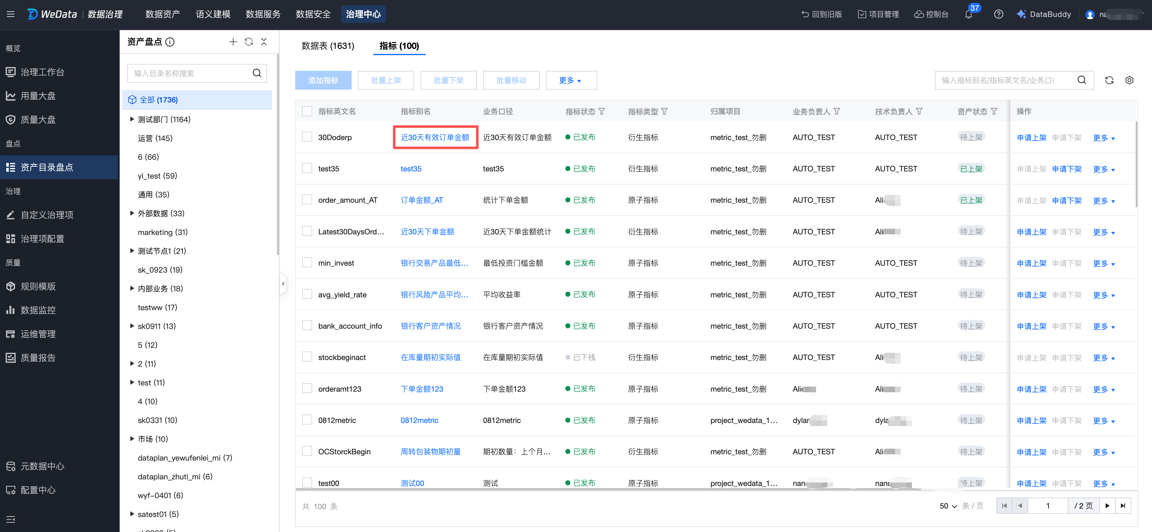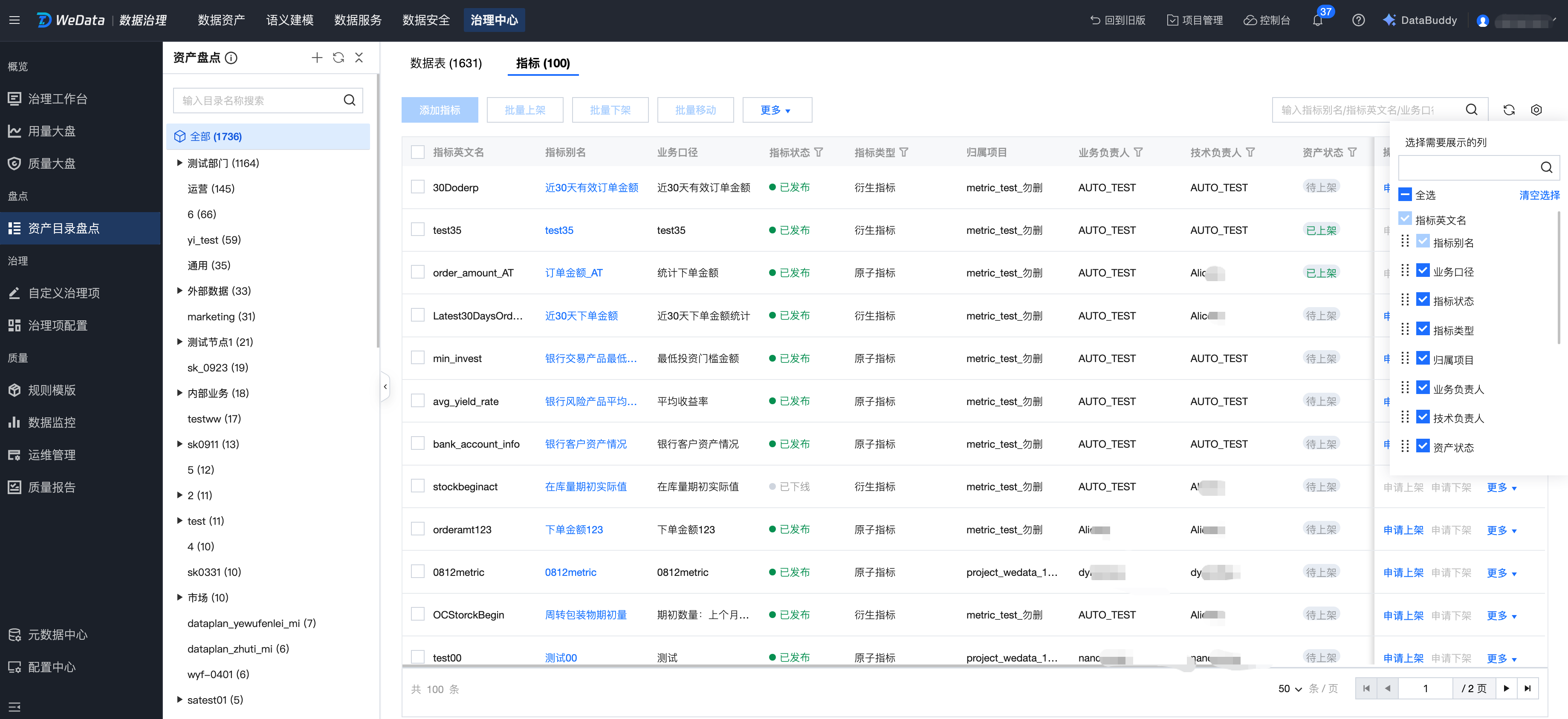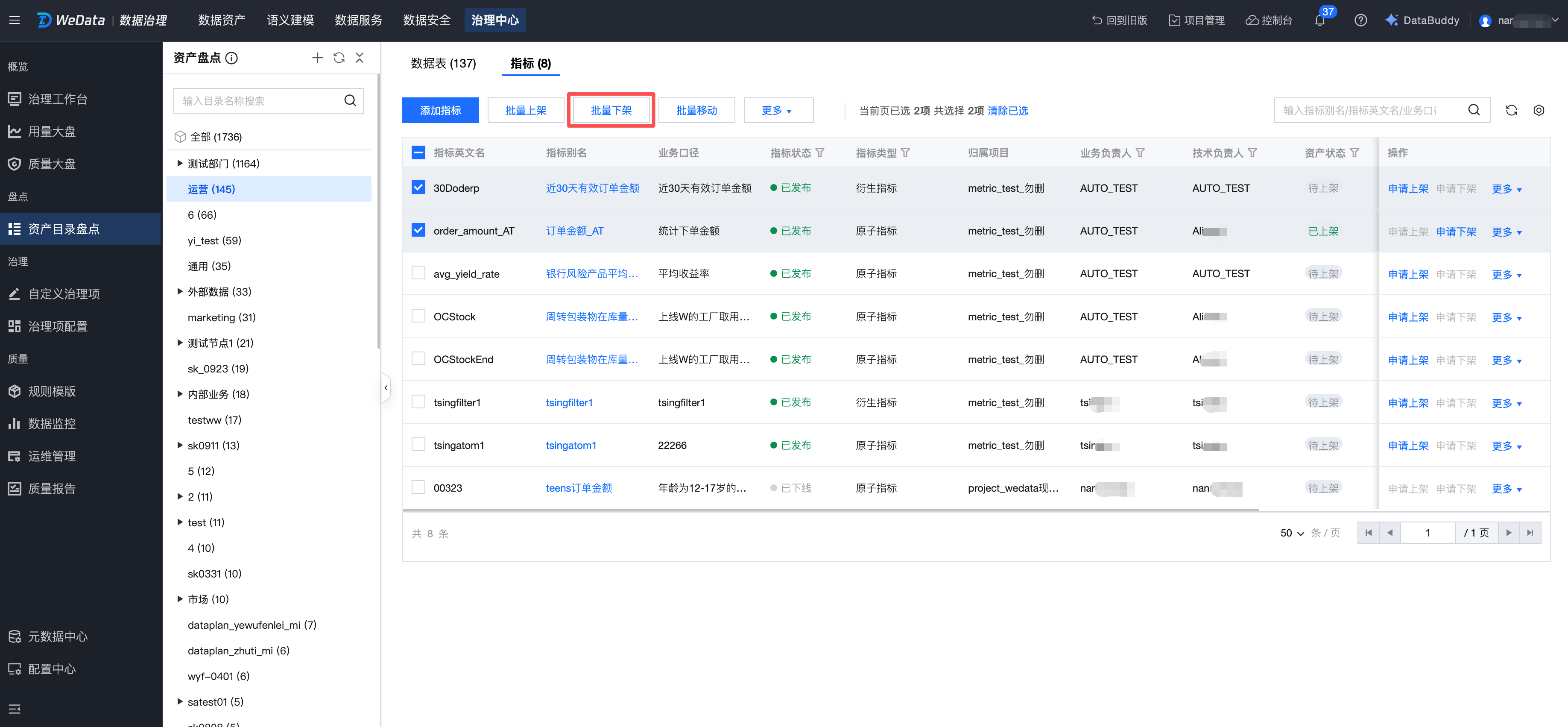 对指标的盘点:添加指标、移动(批量移动)指标、表上下架(批量上下架)、转交指标业务负责人、转交指标技术负责人等。
