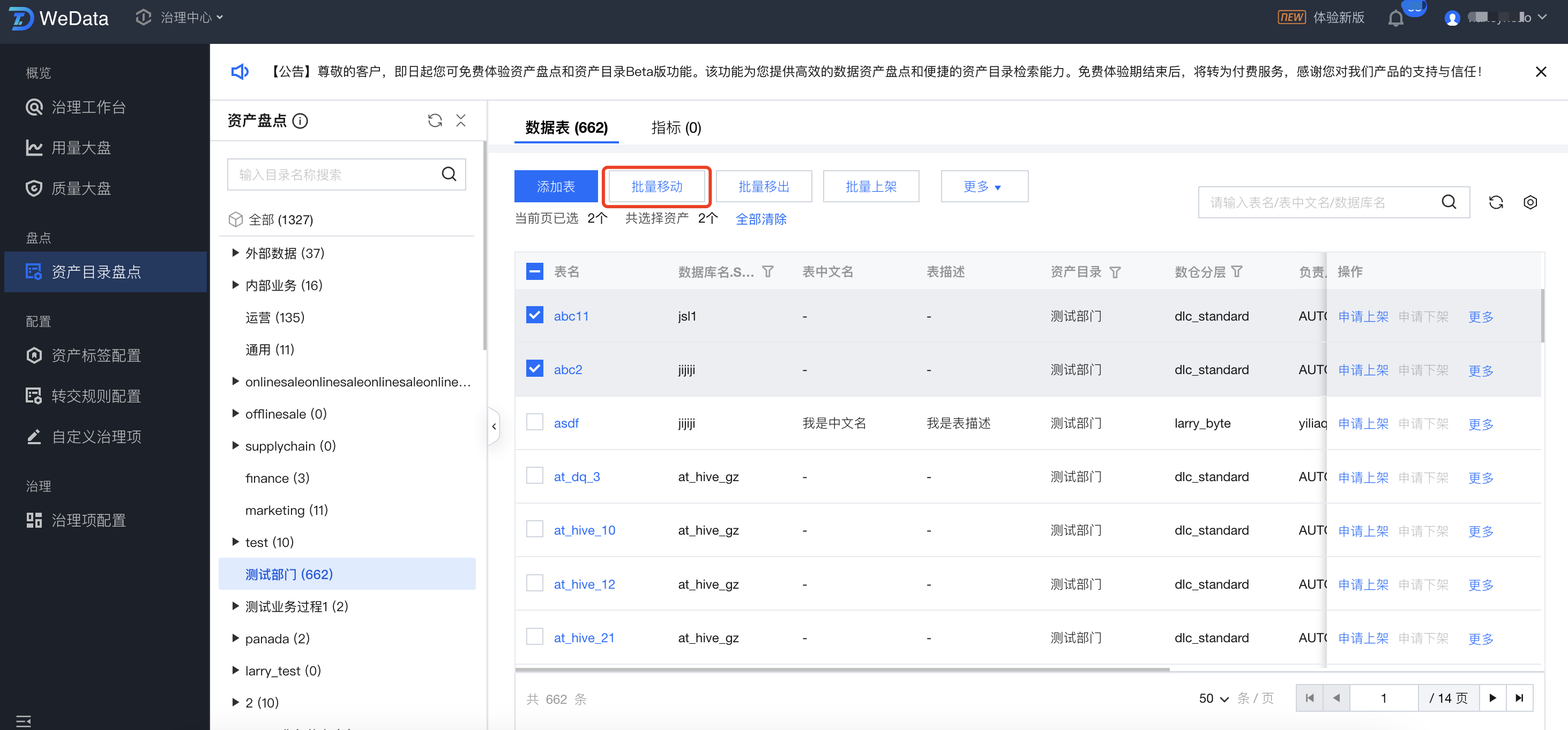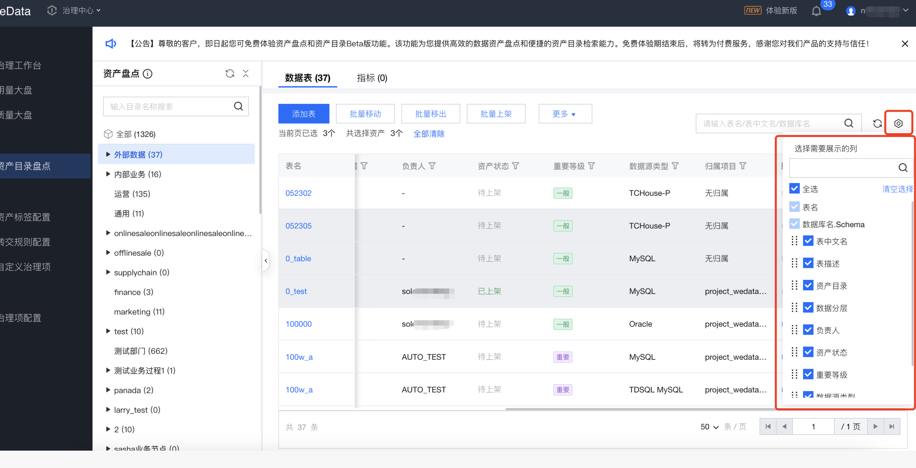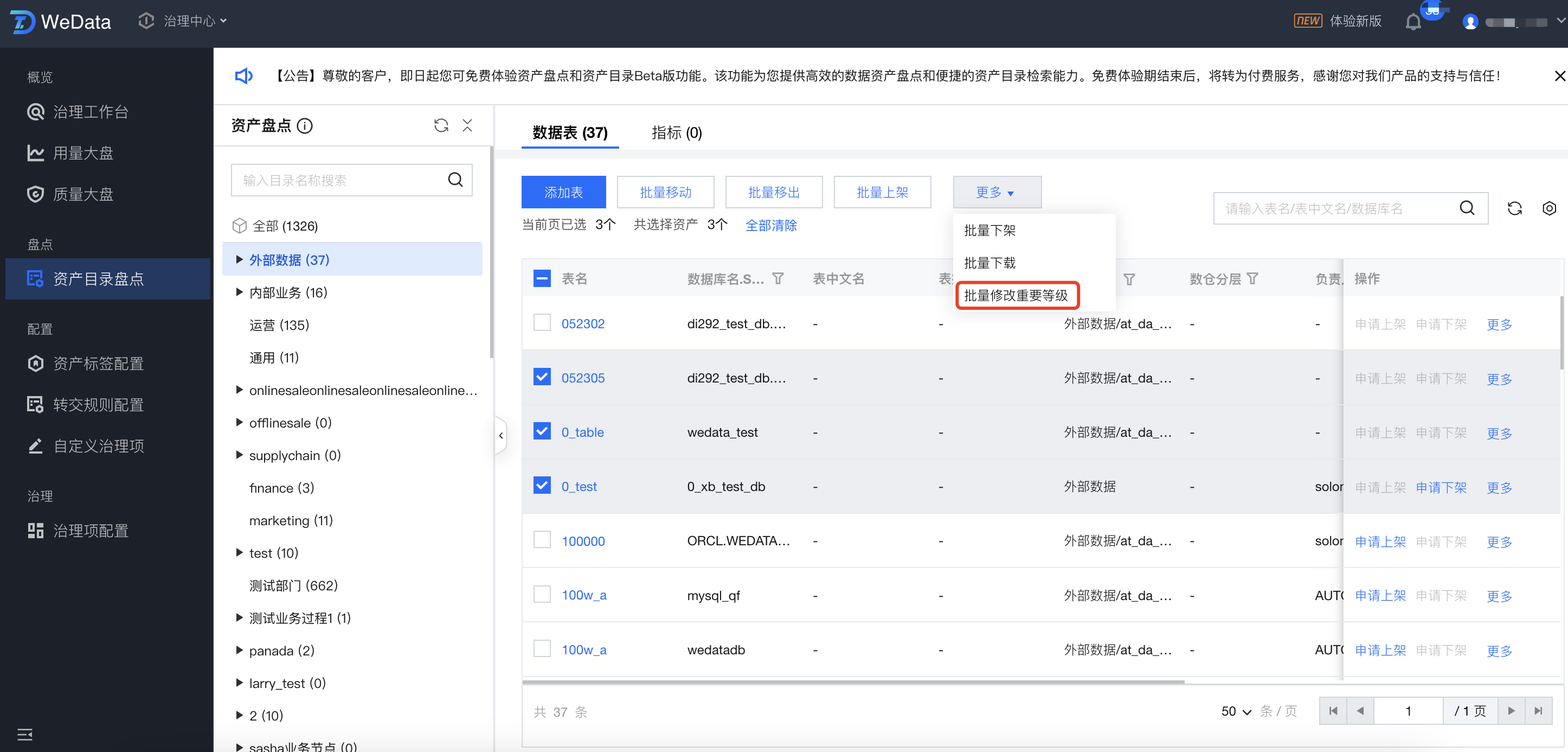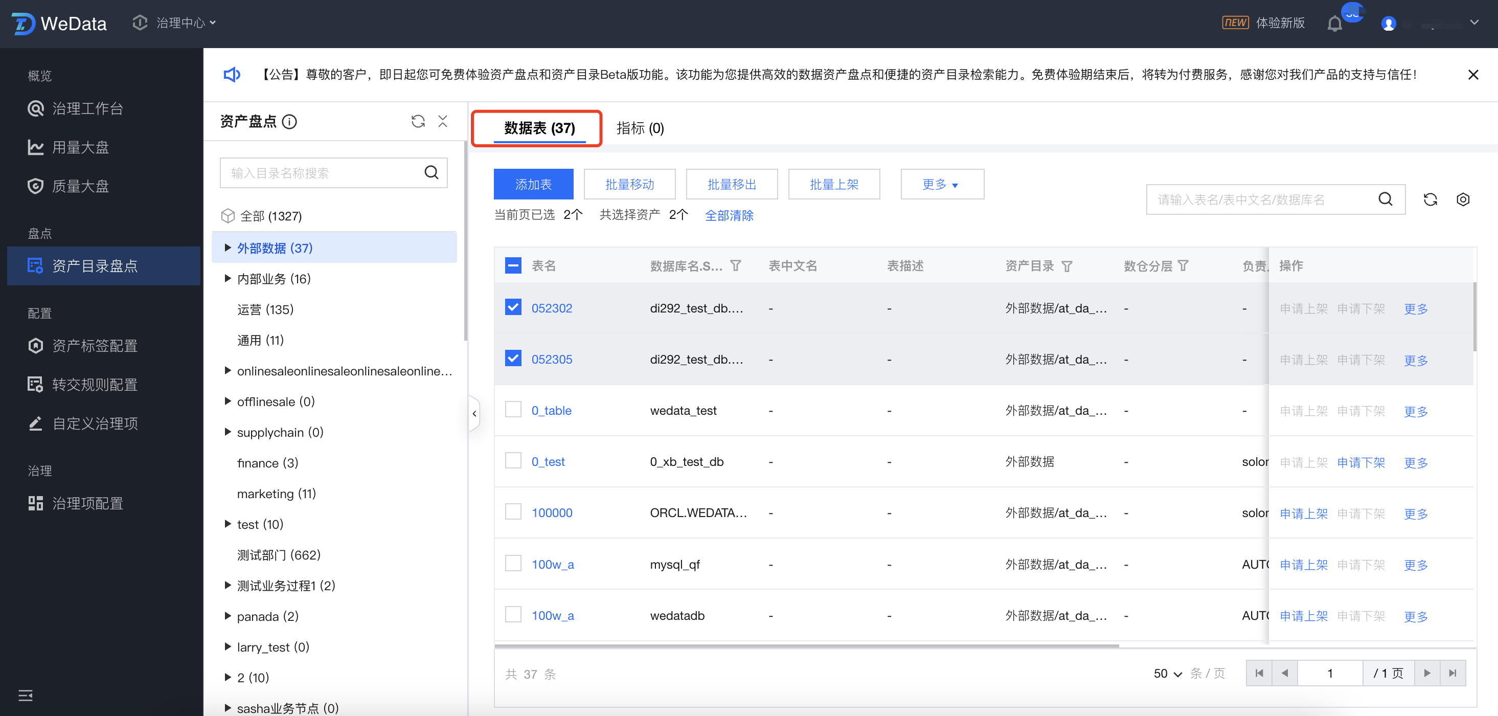 列表中,支持选中资产目录,对对应目录中的数据表进行盘点。